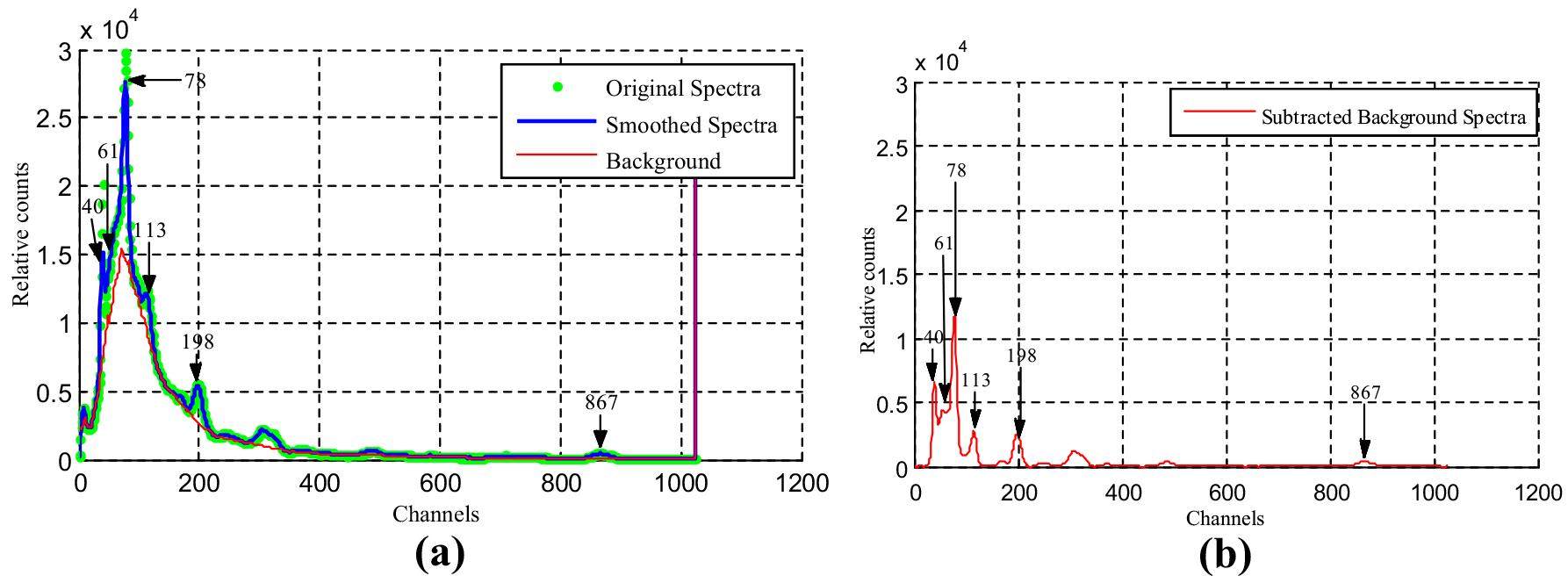 The experimental spectra of 238U and 232Th radionuclide series were tested to validate the feasibility of the proposed method in practical applications. The radioactive sources used in the experiment adopts the 238U radionuclide Series with mass fraction of 186×10-6 and specific activity of 2308.26 Bq/kg, and the 232Th radionuclide Series with the mass fraction of 157×10-6 and specific activity of 638.99Bq/kg, their physical conditions are solid and shapes are globular. Experimental spectra were obtained using a NaI(Tl) detector with an energy resolution of 7.9% and dimensions 75 mmΦ × 75 mm, and a custom developed 1024 channel digital signal processor (DSP) multi-channel spectrometer with a universal serial bus (USB) interface, integral non-linearity <0.1%, differential non-linearity <0.2% energy 50–3000 keV, counting rate >20 k, automatic spectra-stabilization, and an energy calibration E = 2.9577 keV/ch. The relative measurement method was employed in all tests.