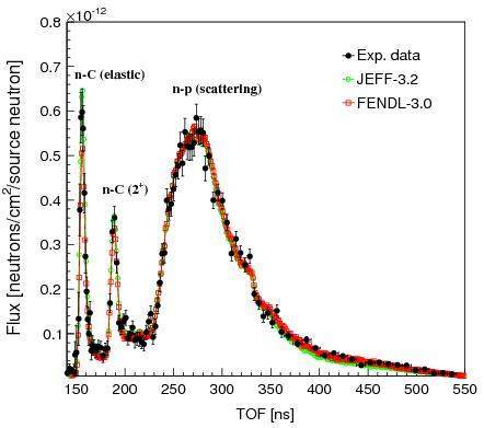 The leakage neutron spectra calculated with JEFF-3.2 (red solid line in Fig. 4) agree well with the measured spectra in the whole neutron energy range at 60° and 120° for the both sample thicknesses. Therefore, JEFF-3.2 is considered as precise enough within this energy range.
