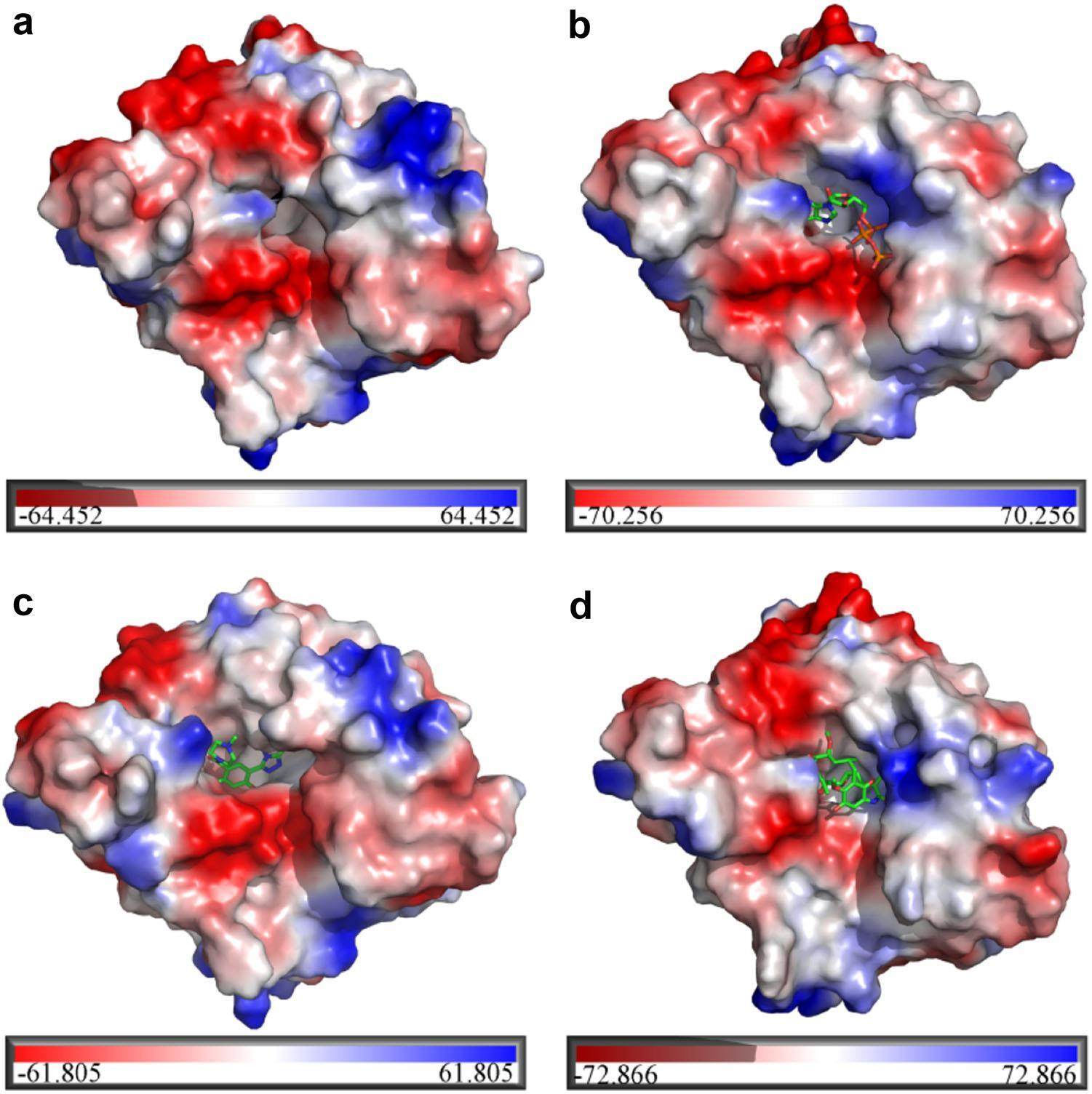 Figure.4 shows the electrostatic potential surface distribution surrounding the active pocket of Hsp90N (Fig. 4(a)), Hsp90N-ATP(Fig. 4(b)), Hsp90N-RJ19(Fig. 4(c)) and Hsp90N-GDM (Fig. 4(d)).Compared with native Hsp90N, changes have been taken place in the electrostatic potential surface surrounding the active pocket of Hsp90N responsible for binding of ATP, RJ19 or GDM. In common with the structure of ATP-Hsp90N, RJ19or GDM binding site of Hsp90 is located in the ATP-binding pocket. It is interesting that RJ19 binding induces structural rearrangements of L2loop and makes the ATP binding pocket wider and longer, which provides a larger room for structural modification of RJ19 later.