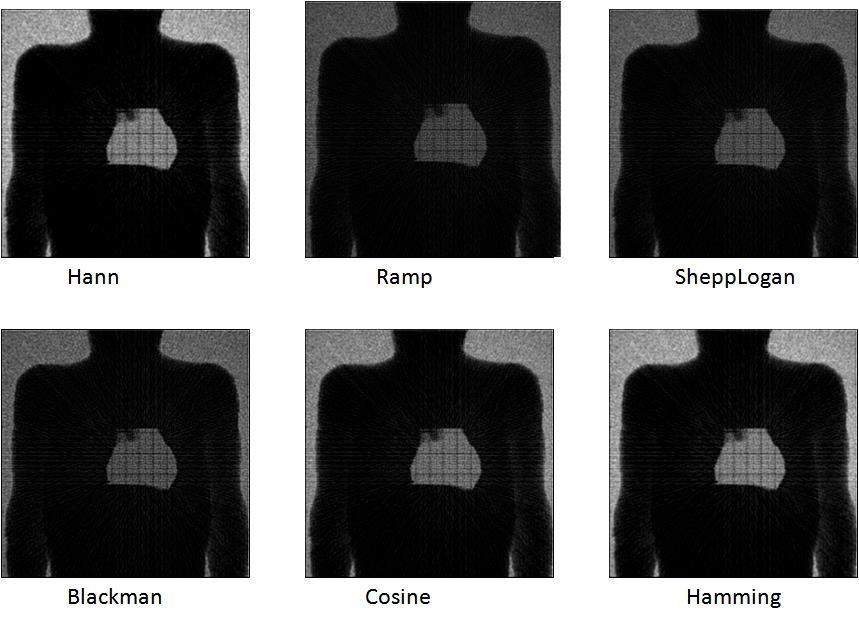 For each case (projection), we collected the number of primary particles reaching the detector zone and the corresponding coordinates on a voxelized detector of 512×512 pixels. Thus, for each run we have a projected image of the HDRK-Man. Then, we used the ImageJ software [13] with the specific plugin "Radon", which is able to performs a radon transform (by using a Filtered Back Projection(FBP) algorithm) on it [24]. The analytical method FBP is still the most widely used in clinical applications because of its simplicity, speed, and computational efficiency. The provided filters by such plugin are given by the following equations [25,26]: