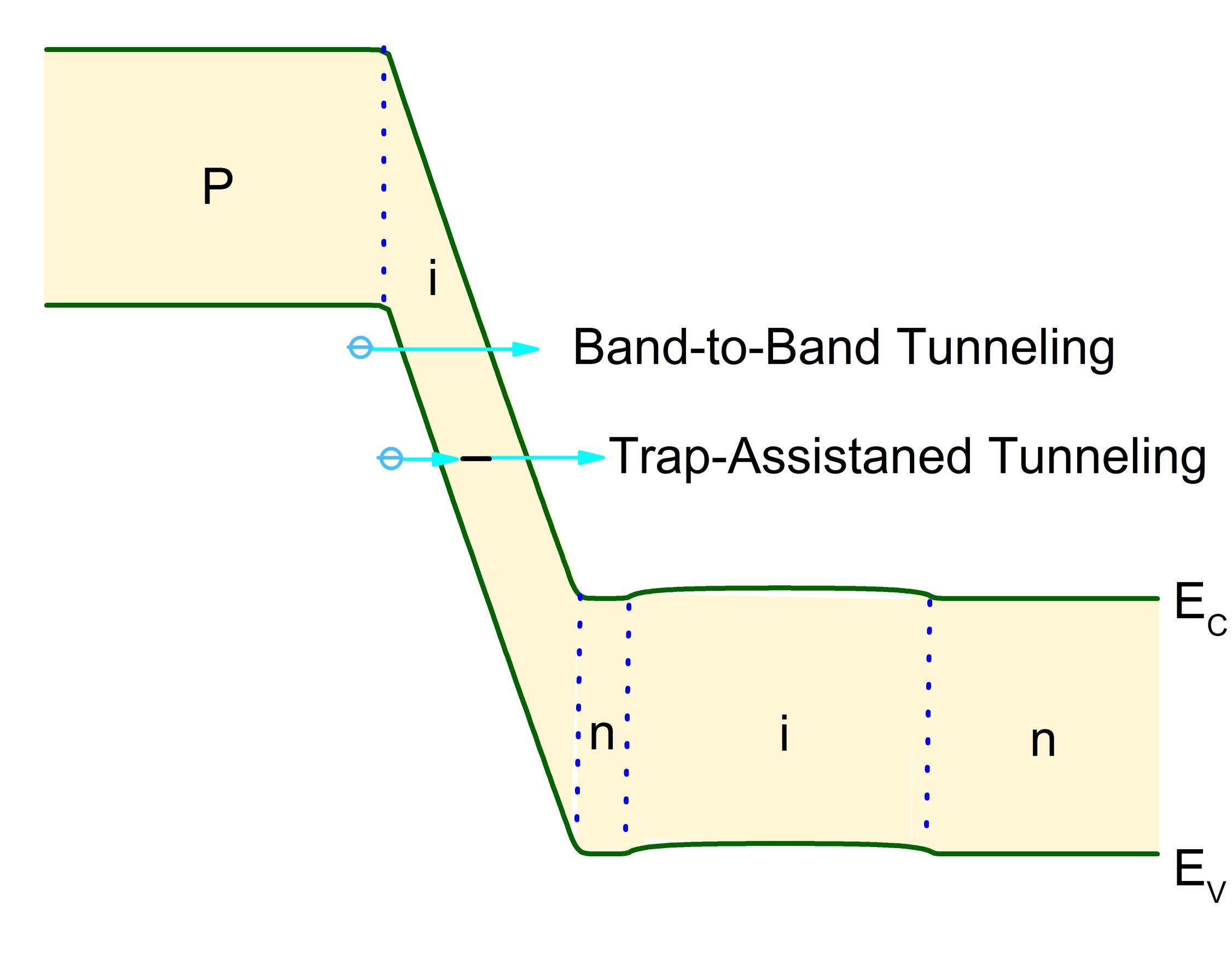 The band-to-band tunneling current and trap-assisted tunneling become the dominant mechanisms at the higher voltage. Both direct band-to-band tunneling and tunneling through traps in the band-gap are illustrated in Fig. 4 [27]. The current density for direct-gap semiconductors can be given by the expression [21]