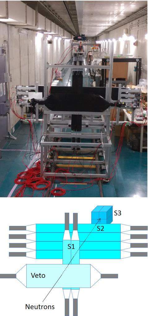 Previously, the prototype detectors were constructed and their performance was tested using radiation sources [18, 19]. However, because the mean kinetic energy of neutrons from 252Cf is only ∼1.7 MeV, the further investigation of the performance at significantly higher kinetic energies at a few hundreds MeV is strongly desired. Therefore, we set up a small neutron detector array using several prototype detectors at the N0 beamline, dedicated to neutron beam research, at the Research Center for Nuclear Physics (RCNP) in Japan, as shown in Fig. 9.