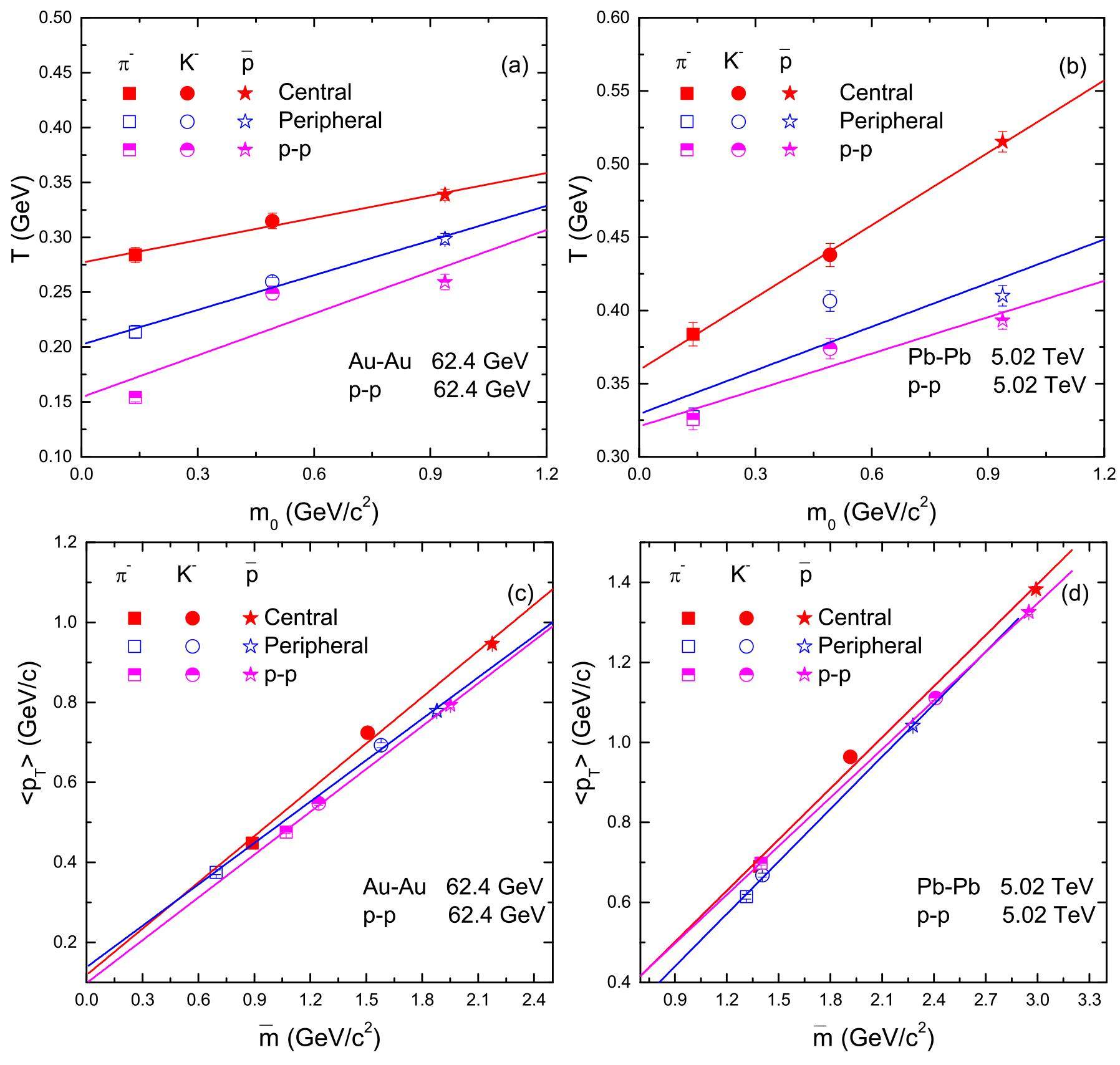 To study the change in the trends of parameters with the particle mass, Figs. 4(a) and 4(b) show the dependences of T on m0 for productions of negative charged particles in central and peripheral (a) Au-Au collisions at 62.4 GeV and (b) Pb-Pb collisions at 5.02 TeV, while pp collisions at (a) 62.4 GeV and (b) 5.02 TeV are also studied and compared to peripheral AA collisions of the same energy (per nucleon pair). Correspondingly, Figs. 4(c) and 4(d) show the dependences of 〈pT〉 on