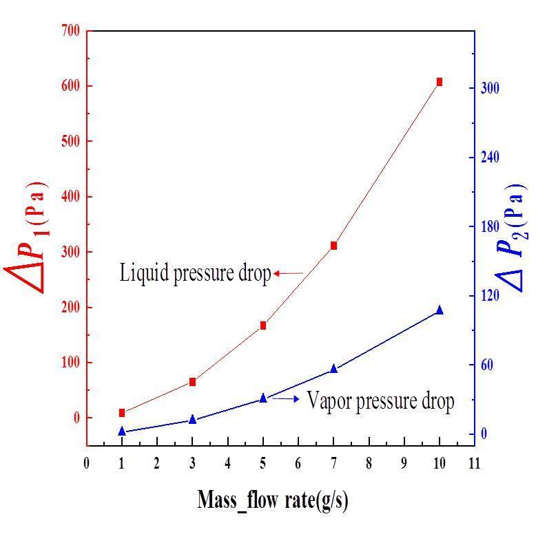 A detailed description of the design of the J-T heat exchanger has been provided in the literature [31]. The relationship between the liquid and vapor pressure drop and the mass flow rate is shown in Fig. 12, and the relationship between the liquid and vapor outlet temperature and the mass flow rate is shown in Fig. 13.