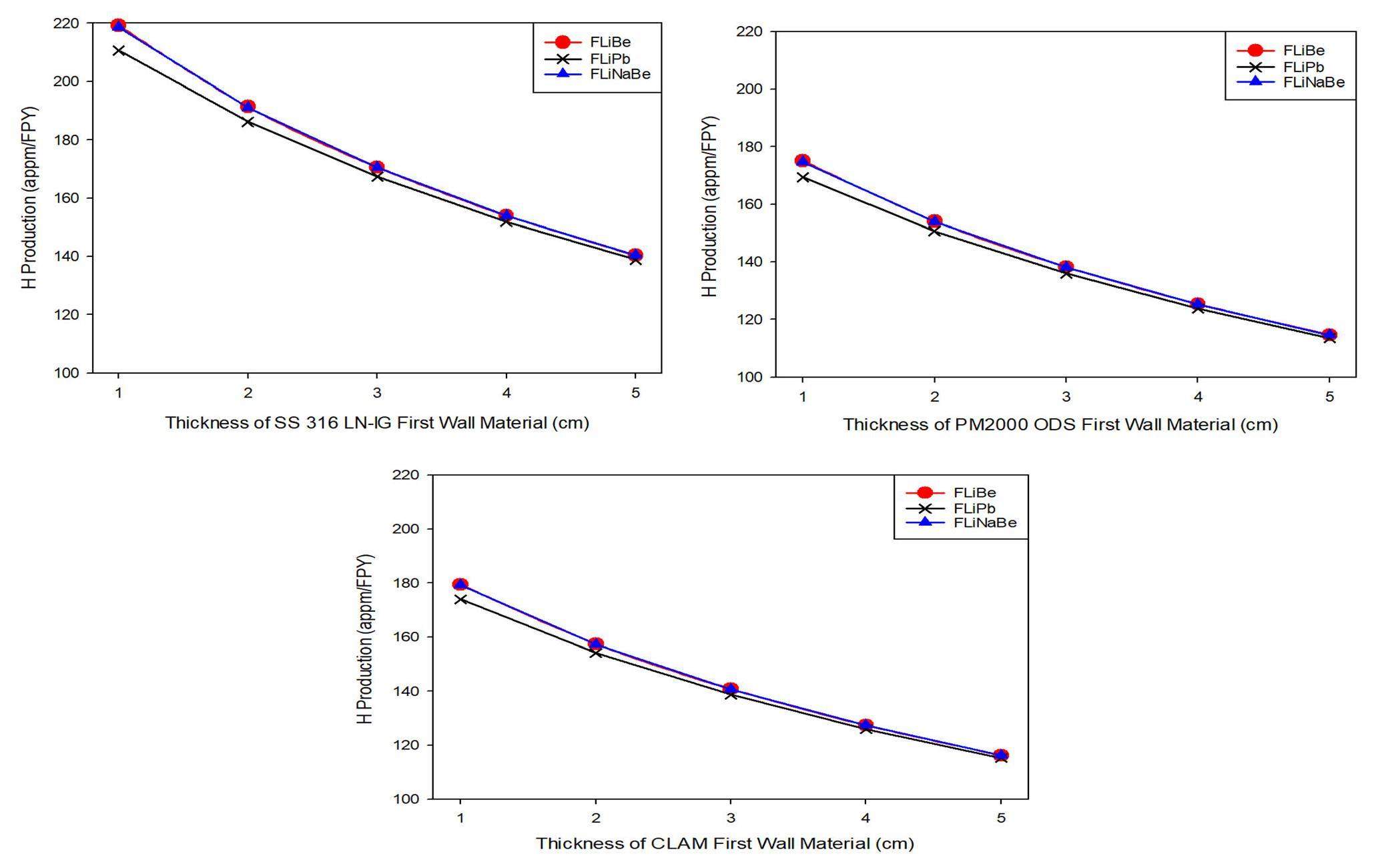 Figure 9 shows the change in H production with respect to the thickness of the first wall materials. H production decreases as the material thickness increases, and has approximately the same values per full power year for all first wall materials. As shown in Figure 9, the lowest H production values were obtained for the FLiPb coolant, and the highest H-production values were obtained for the FLiBe and FLiNaBe coolants, which had almost the same H production values. As shown in Figure 9, the values obtained for the FLiBe and FLiNaBe coolants were slightly higher than the ones for FLiPb. The highest H production values were 219.2, 175.1, and 179.5 appm/FPW and the lowest were 140.3, 114.6, and 116.2 appm/FPW using FLiBe and FLiNaBe coolant for SS316, ODS and CLAM, respectively. The reductions in the H production value were 35 %. Because all the hydrogen isotopes produced by the (n, p), (n, d), and (n, t) reactions diffuse out of the metallic lattice or form metal hybrids, H production values were not considered in this study. Therefore, no damage limit was chosen for H production.