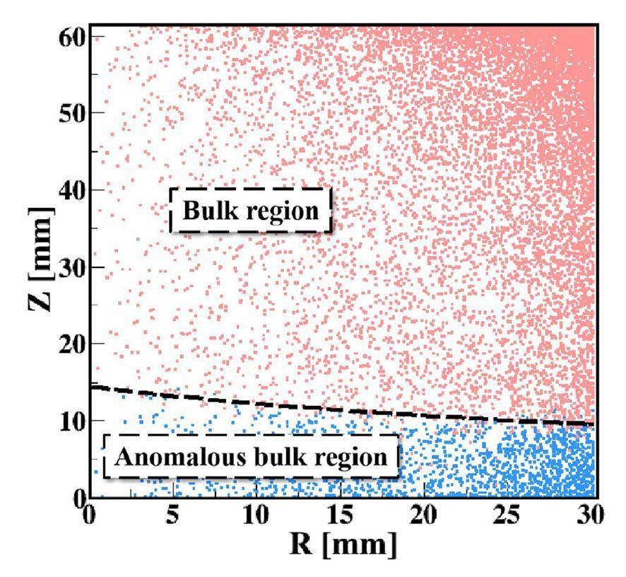 Figure 13 shows the simulated locations of these two types of events in the CDEX-1B detector according to the 525舁ns cut above 15舁keVee. FBEs (blue dots) are distributed near the passivation layer at the bottom of the detector. This result is consistent with the region predicted above. The volume ratio of the FBE region to the volume of the entire crystal is 18.8%, which is consistent with that derived from the 68Ge peak separate-uncertainty16.2(30)% and 65Zn peak 19.4(52)%. Both isotopes are cosmogenic nuclides and are expected to be uniformly distributed in germanium crystals.