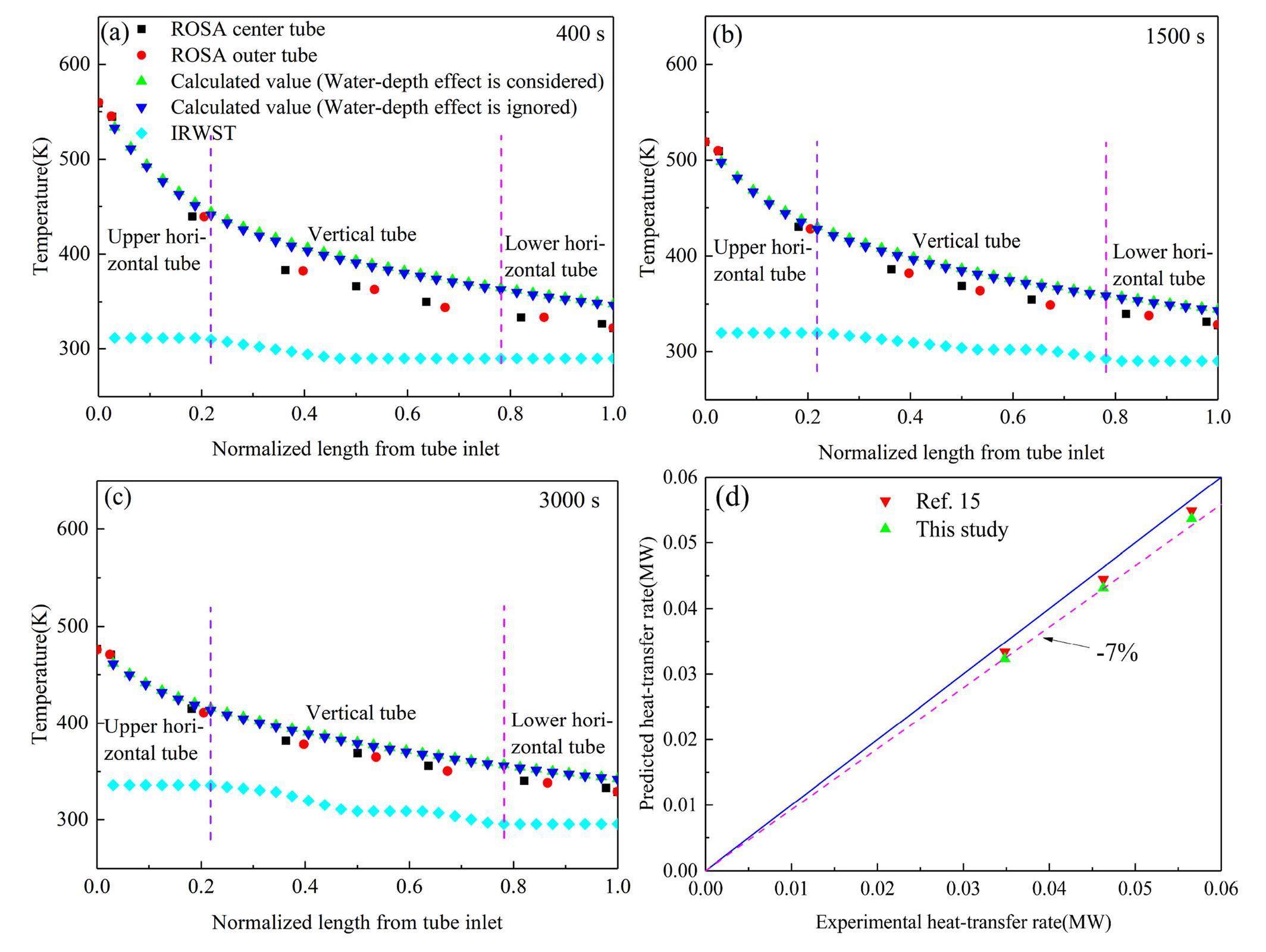The comparison results for 400, 1500, and 3000 s are shown in Figs. 5a-c. In these figures, the X coordinate indicates the normalized length, and the Y coordinate indicates the temperature. In the legend, “IRWST” refers to the water temperature, “ROSA center tube” and “ROSA outer tube” refer to the ROSA experimental data, and “Calculated value” refers to the results obtained via the proposed iterative calculation method.