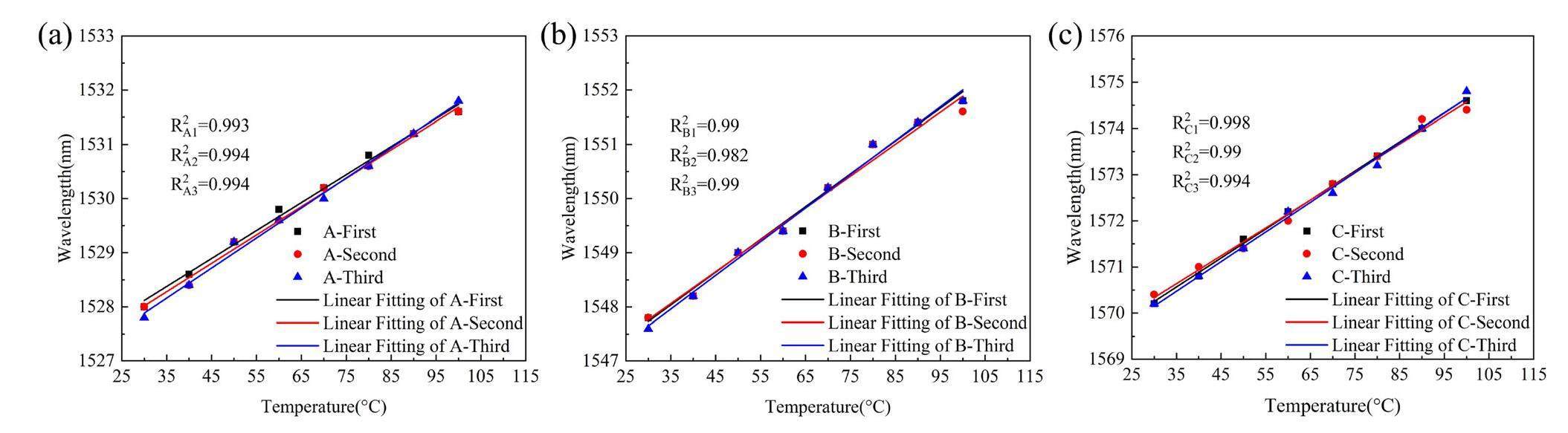 To verify the repeatability of the SDNS sensor coated with the PDMS film, a repeated temperature measurement experiment was performed, with measurements made once a week for a total of three times. Meanwhile, the data for each temperature measurement experiment were recorded. The temperature range remained constant at 30-100 °C, and the temperature measurement procedure remained unchanged. The results of these repeated experiments are shown in Fig. 10. According to the linear fitting results for the temperature and wavelength of the repeated experiment, it can be seen that the error for the three temperature measurement results was relatively small, which indicated that in the temperature range of 30-100 ℃, the SDNS sensor coated with the PDMS film had good temperature stability after irradiation, and could be reused in a radiation environment.