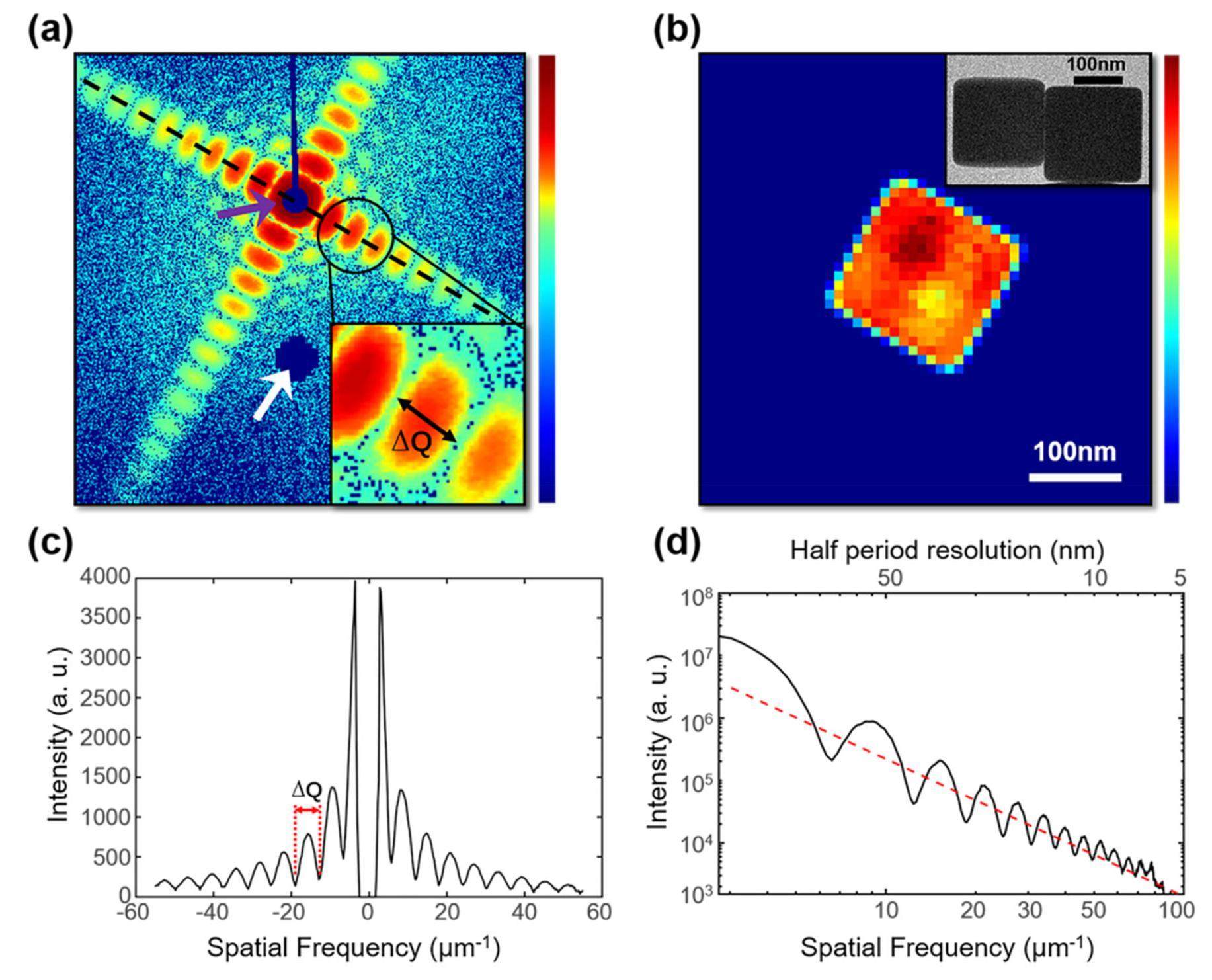 Phase retrieval was applied to the diffraction pattern to obtain a real-space image of the sample. Two thousand hybrid in-out (HIO) iterations following 200 error reduction (ER) iterations were used during one reconstruction cycle, and 1000 independent reconstructions were conducted. Figure 3(b) shows the reconstructed image with an average of 100 selected reconstructions, depending on the reconstruction errors; it exhibited a square shape with a slightly uniform density distribution. The inset in Fig. 3(b) shows a transmission electron microscope (TEM) image of similar nanocubes, and the reconstructed image shows good consistency with the TEM image. The edge length of the cubic particles can be estimated from the following equation: