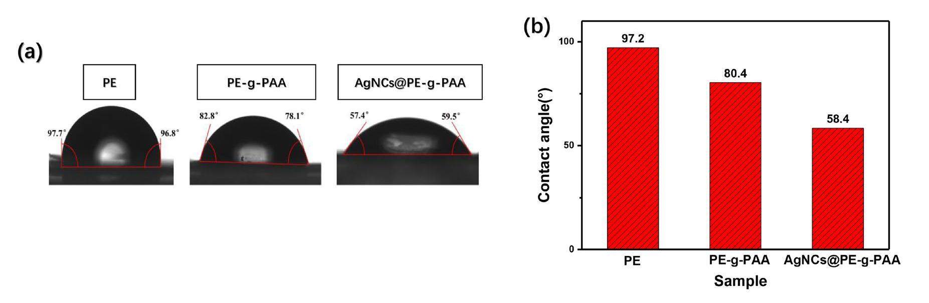 The morphology of the film did not change during the synthesis of AgNCs@PE-g-PAA, indicating that the synthesis process did not cause serious damage to the matrix. This improves the universality of the synthesis method. The matrix material used in this study was a commercial PE film. The PE film comprises a nonpolar -CH2-CH2- structure. As shown in Fig. 3(a) and Fig. 3(b), the contact angle of the commercial PE film is 97°, indicating that the material is hydrophobic. After the grafting of PAA, the contact angle of PE-g-PAA decreased to 80° (Fig. 3B(b)) because of the strong polarity of the carboxyl group of PAA, and the material became hydrophilic. This is conducive to the subsequent adsorption of Ag+ ions from the aqueous solution to achieve the loading of AgNCs. After loading the AgNCs, the contact angle of the AgNCs@PE-g-PAA film decreased further to 58° (Fig. 3(b)). Owing to the combination of AgNCs and the carboxyl groups on the PAA chain, the polarity of the material increased, and the material became more hydrophilic[45]. In addition, the AgNCs@PE-g-PAA film could be used to detect metal ions in aqueous solutions.