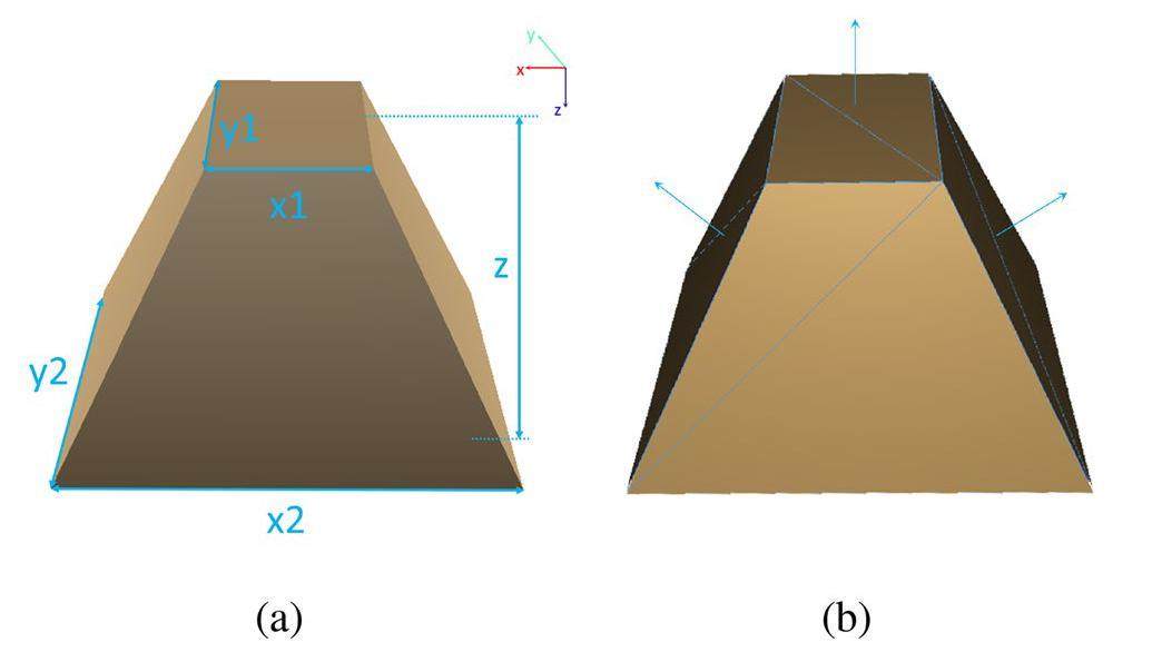 The first step in the conversion is to map the shape description into the FBX format for all types of standard shapes in DD4hep. The current detector description systems in the HEP software, including Geant4, ROOT, GDML, and DD4hep, employ the CSG system, which uses characteristic parameters to define the shape of a solid. FBX depends on a surface definition system that uses a set of polygons with vertices and a normal to define the surface of a solid. For example, as shown in Fig. 7 (a), to describe a TRD2 shape, which is a trapezoid with both the X and Y dimensions varying along the Z-axis, the CSG system requires only five parameters: