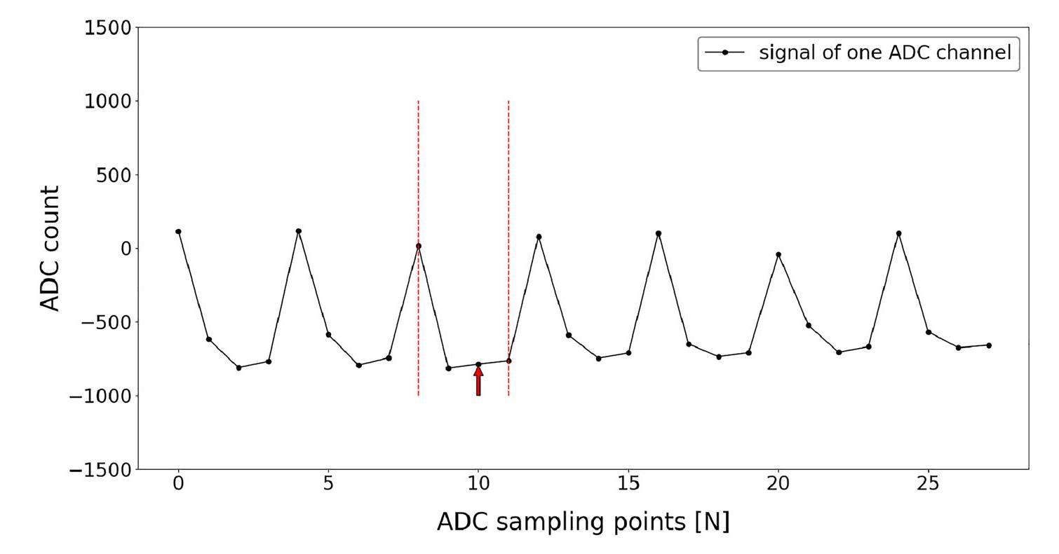 The Topmetal-M chip has a matrix of 400 × 512 pixel cells. Owing to a design error in the digital module, only 128 × 512 pixels, which were distributed directly at the top of the chip, could be scanned properly. The matrix was divided into 16 channels (128 × 32 pixels per channel), and all channels could be read out simultaneously. The digital scan clock range of Topmetal-M was 1–40 MHz. After data processing and comparison, it was found that the chip could achieve an optimal effect with a scan clock of 10 MHz. Therefore, the digital scan clock was set to 10 MHz for all the test results presented in this paper. The frame rate of the chip was 2.44 kHz with this scan clock. The analog outputs of Topmetal-M were sampled by a 12-bit ADC with a sampling clock of 40 MHz, which was generated from the same source as the digital scan clock. Thus, each pixel had four sampling points. Figure 8 shows the ADC sampling waveform of the signal. The value of the third sampling point on a pixel was the most stable point during pixel switching and was used as the value of the current pixel.