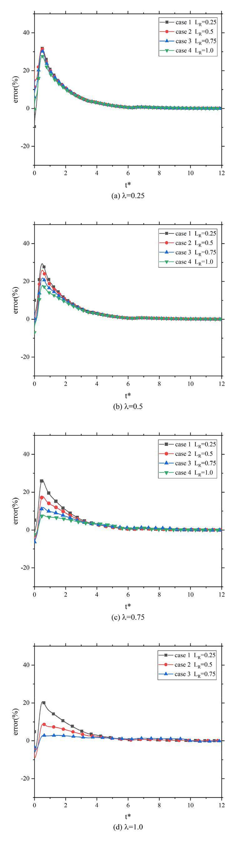 In addition, a comparison of the error between the normalized mass flow rate and the normalized temperature difference between the hot and cold sections shows an evident phenomenon: if a small dilation number is selected, the difference between the dynamic error curves corresponding to different length ratios is very small (Fig. 11(a) and Fig. 13(a)). The same conclusion is obtained for the normalized mass flow rate and normalized temperature difference between the hot and cold sections. When the dilation number is gradually increased, this phenomenon disappears (Fig. 11(b-d) and Fig. 13(b-d)). These results are consistent with the previous analysis of Fig.11.