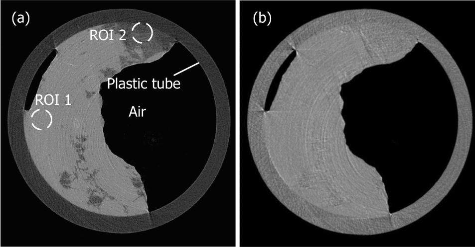 In DECT, it is intuitive to choose low/high energy as far from each other as possible. Because too-low X-ray energy would increase image noise, the 10 keV and 30 keV were chosen as the low/high energy. In order to ensure the same object position in scanning, each sample should take DECT twice under 10 keV and 30 keV monochromatic X-rays alternately, and scan another sample. The low-energy X-ray absorption images were taken first within the π angular range under 10 keV. Then the sample was rotated backward to the beginning along the vertical axis. The X-ray energy was changed to 30 keV for next scanning. For each CT scan, the total number of views was 540 covering the π angle range. The data acquisition time and exposure, which depend on the photon flux density, takes about 2–4 min per CT scanning. It is necessary to slowly rotate the scanned object to prevent motion artifacts. The refraction effect can enhance the material boundaries and the image contrast, but also could cause inaccuracy in the electron density images. We shorten the object to detector distance at less than 10 cm to eliminate the boundary enhancement in the reconstruction images.