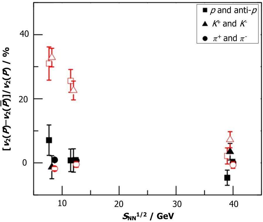 It is known from heavy ion collisions at lower collision energies at SIS/GSI and AGS/BNL that the elliptic flow of nucleons is affected not only by their scattering but also by their mean-field potentials in the hadronic matter[21]. This is because particles with attractive potentials are more likely to be trapped in the system and move in the direction perpendicular to the participant plane while those with repulsive potentials are more likely to leave the system and move along the participant plane, thus reducing and enhancing their respective elliptic flows. Also, the potentials of a particle and its antiparticle are different, and they generally have opposite signs at high densities[22,23]. As a result, particles and antiparticles are expected to have different elliptic flows in heavy ion collisions when the produced matter has a nonzero
