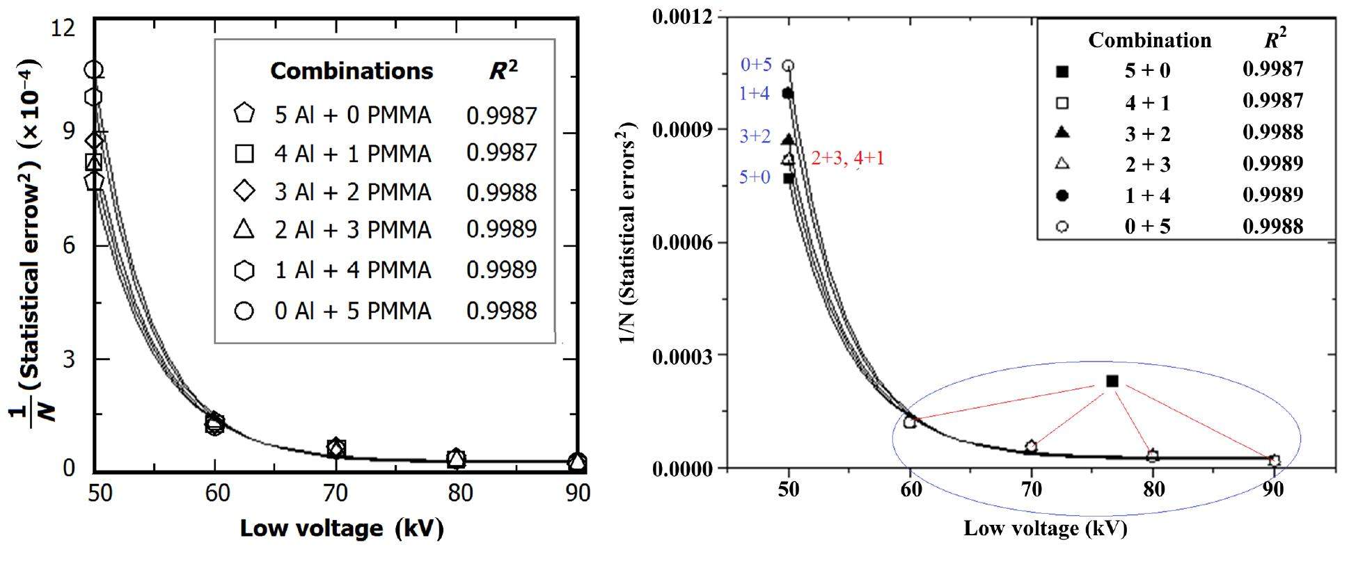 The squared statistic counting error, 1/N (N is the number of photons), as a function of low voltages is shown in Fig. 4. The results were obtained by EGSnrc M-C simulation of different thickness combinations of Al and PMMA, assuming a 100% detection efficiency. The statistical errors are insensitive to the Al and PMMA thickness combinations in the thickness range under investigation. The curves of "2Al + 3PMMA" and "4Al + 1PMMA" overlap in Fig. 4. At low voltage of over 60 kV, the statistical errors of all the Al and PMMA thickness combinations are approximately constant.