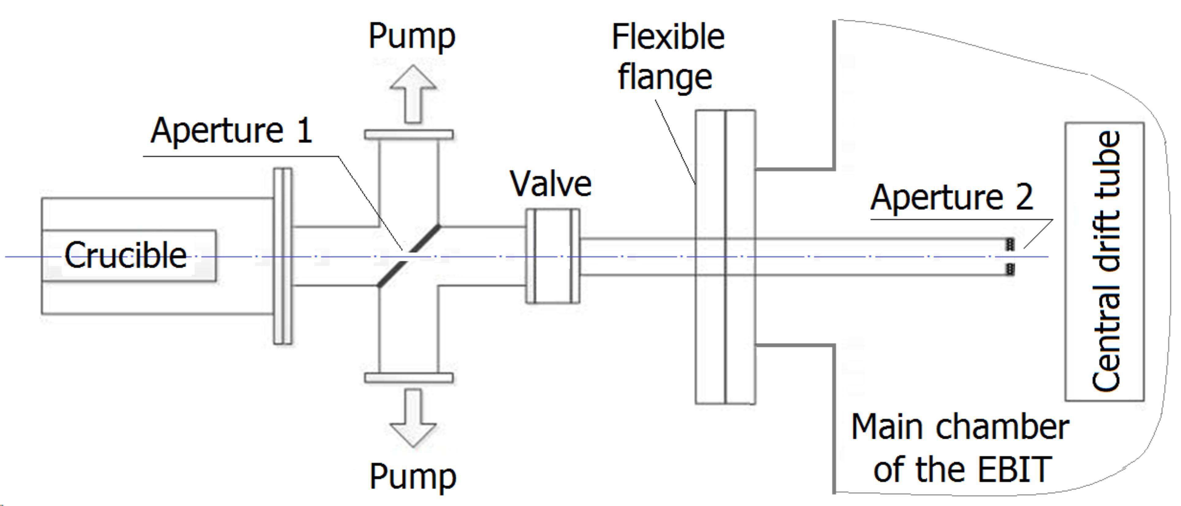 Aperture 1 in the 45 plate is used to confine diffused metallic vapor effusing out from the crucible. The vacuum between the two apertures is better than 10-6 Torr (1.3×10-4 Pa), and the mean free path of gas is over 50 m, being longer than the distance between the two apertures. So, after passing Aperture 1, the vacuum is high enough for metal atoms to go through the tube, or hit the wall of the vacuum line without collisions with other atoms. The valve keeps vacuum of the main-chamber when the K-CELL crucible needs to be charged or changed, and to prevent it from contaminant gases of initial heating of the K-CELL. The straight pipe, with a flexible flange connecting the EBIT, has a small aperture (Aperture 2) into the main-chamber and near the center drift tube (DT2), allowing the atomic beam to enter the drift tube region and cross with the electron beam. The drift tube has a 1 mm×20 mm slit. Aperture 2 and the crucible of the K-CELL can be shifted by one or two millimeters by changing their support frames.