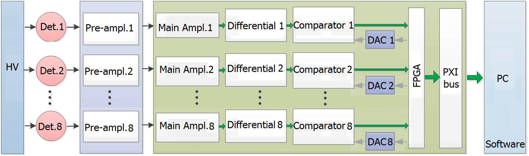 A block diagram of the fusion neutron spectrometer based on PXI bus is shown in Fig. 1. It consists of eight detector/pre-amplifier/main-amplifier, and system controller of PXI chassis. The charge-sensitive pre-amplifiers use NIM chassis and the main electronics use PXI chassis. The detector signals amplified by the pre-amplifier are amplified, shaped and filtered by the main electronics. The DACs output the upper and lower thresholds to the comparator through the FPGA. The comparators compare the main amplifier output with the upper and lower thresholds, and the FPGA processes the comparison results. The FPGA uploads eight time-sharing neutron counts to the system controller of PXI chassis through PXI bus. The system controller works out and displays real-time neutron spectrum.