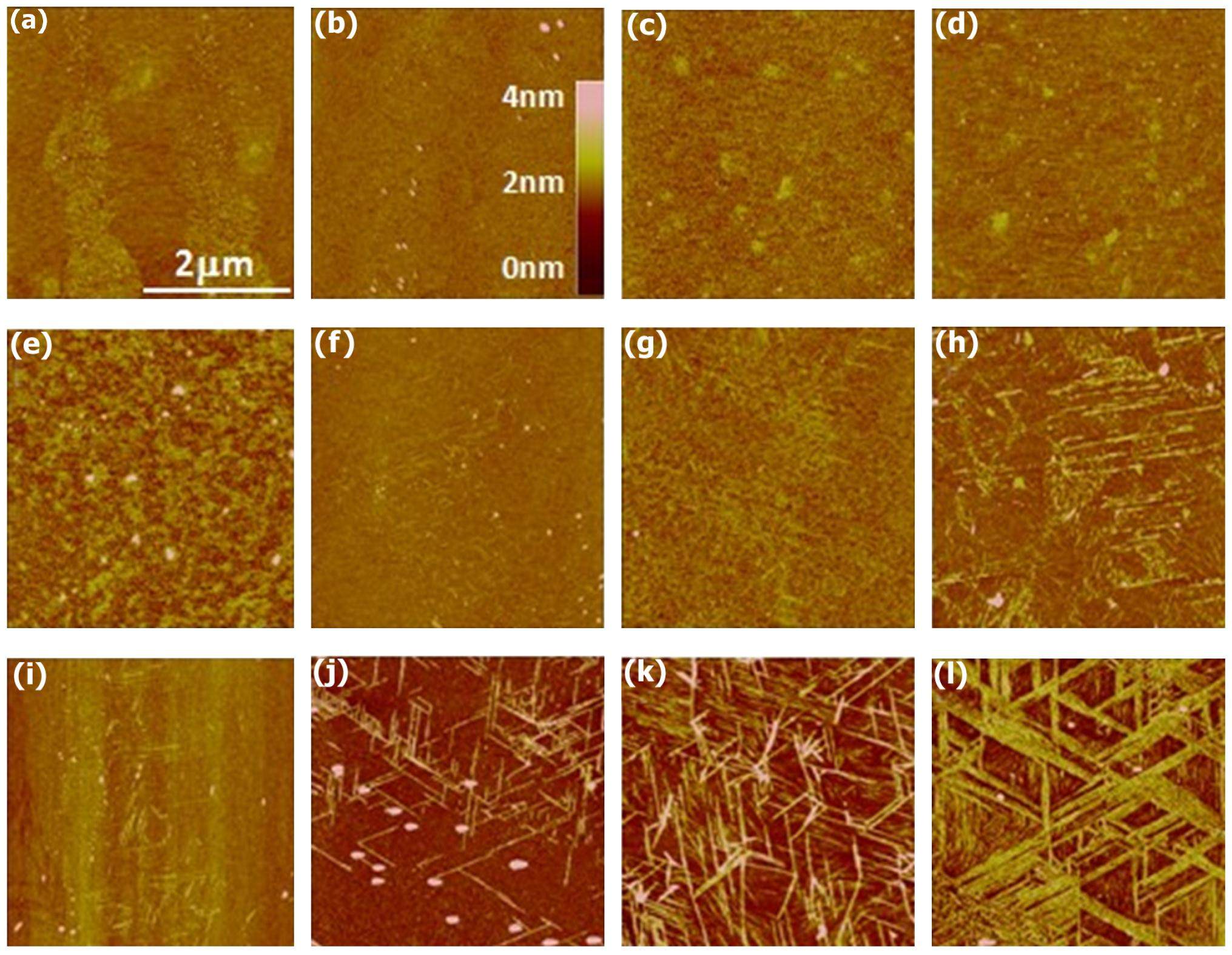 In contrast to bulk water, water confined to a nanometer scale exhibits unique properties, thus has recently attracted much attention from scientists [32-35]. For cells, it is believed that most of intracellular water might be in a nanofilm state because of a crowded intracellular environment [36]. To figure out whether this unique water nanofilm influences GAV-9 peptide self-assembling, we fabricated a depth-controllable water nanofilm system and put GAV-9 molecules in it by employing μCP technique [37, 38]. The results show that GAV-9 adopted a "lying down" manner to grow filaments on a hydrophilic (mica) substrate at a relatively slow rate [39]. The "lying down" fibrillization manner resembles the behaviour of GAV-9 assembling on a HOPG surface. However, difference exists compared this "lying down" manner in nanowater film on a hydrophilic mica to that in bulk water on a hydrophobic (HOPG) surface. In a water nanofilm, the fibrillization rate is much lower and there are no multilayers formed; even with excessive GAV-9 molecules [37, 38]. Despite the debate of whether the water nanofilm could really change the hydrophobicity of mica surface, temperature is another common factor that has not been studied so far. Although a number of papers have already studied how temperature influences a molecule’s self-assembly in a bulk solution, for water nanofilm this should be the first time.