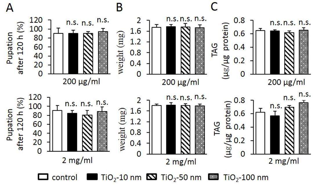 We first examined the effect of dietary TiO2 NPs on Drosophila larval development. In the control group, about 90% of female larvae formed pupae 120 h after egg laying. Either 200 μg/ml or 2 mg/ml dietary TiO2 NPs of three different sizes did not affect the pupation cycle of the Drosophila larvae (Fig. 4(a)). In addition, the weight and lipid level of the female larvae were not altered by any type of TiO2 NPs (Fig. 4(b) and 4(c)).