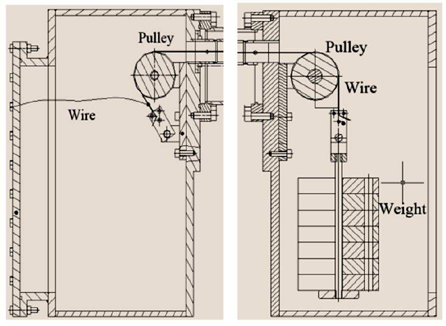 The wire connection with external RF signal and the matching load are made in the two external boxes (Fig. 4). The input side is fixed, and the other side is loaded with a set of steel blocks. At both sides, the copper beryllium wires are allowed to slide on the G10 pulley during contraction or expansion. The wire edges are clamped between G10 blocks, the total weight of steel blocks are 5 kg [15].