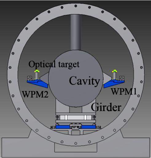 A complete thermal cycle was carried out on the beta-cryostat designed for alignment test only. The beta-cryostat was 2 m long. There were four WPMs symmetrically assembled beside the Φ1 m cavity made of 316 steel, the same material with its girder. A schematic layout of the WPMs and optical targets is shown in Fig. 8. The parts in blue is made of G10 material. Having low thermal conductivity and low thermal deformation [5], it is used as support of the WPMs and optical targets and the bottom insulation layer.