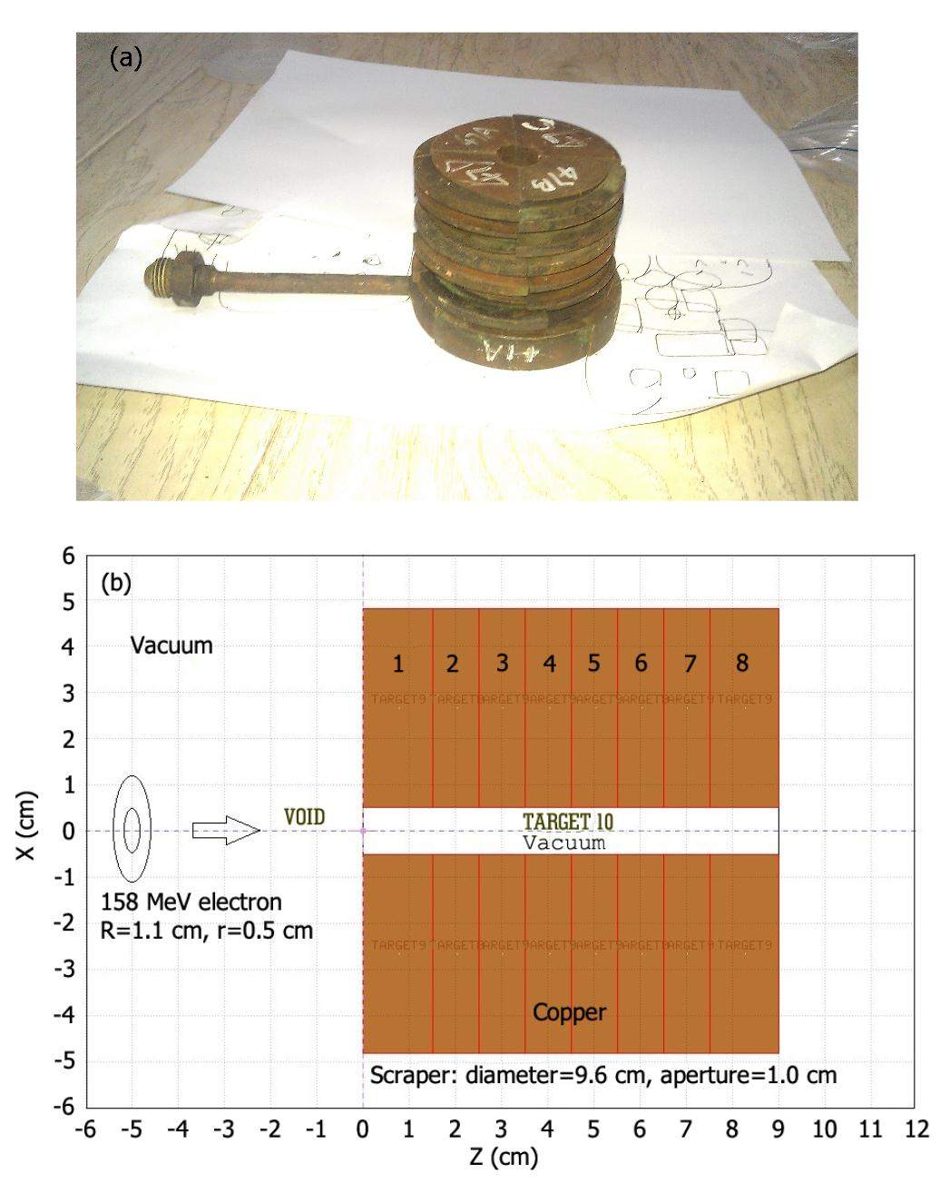 Figure 3 illustrates the fourth scraper and the FLUKA simulation model. The size of the scraper is 9.6 cm×9.0 cm×3.8 cm (diameter (d) × height (h) × wall thickness (w)). Few electrons should have been lost at the scraper, and the loss position should have been random for every instance of operation at the facility. Based on this reasoning, an annular beam shape (2.2 cm×0.6 cm (d × w)) and a uniform electron distribution are assumed. As many as 30000000 simulations were performed to obtain reliable results. The electron energy spectrum at the end of the scraper and the normalized results for the photon fluence (Ephoton>9 MeV) at the fourth scraper are presented in Fig. 4.