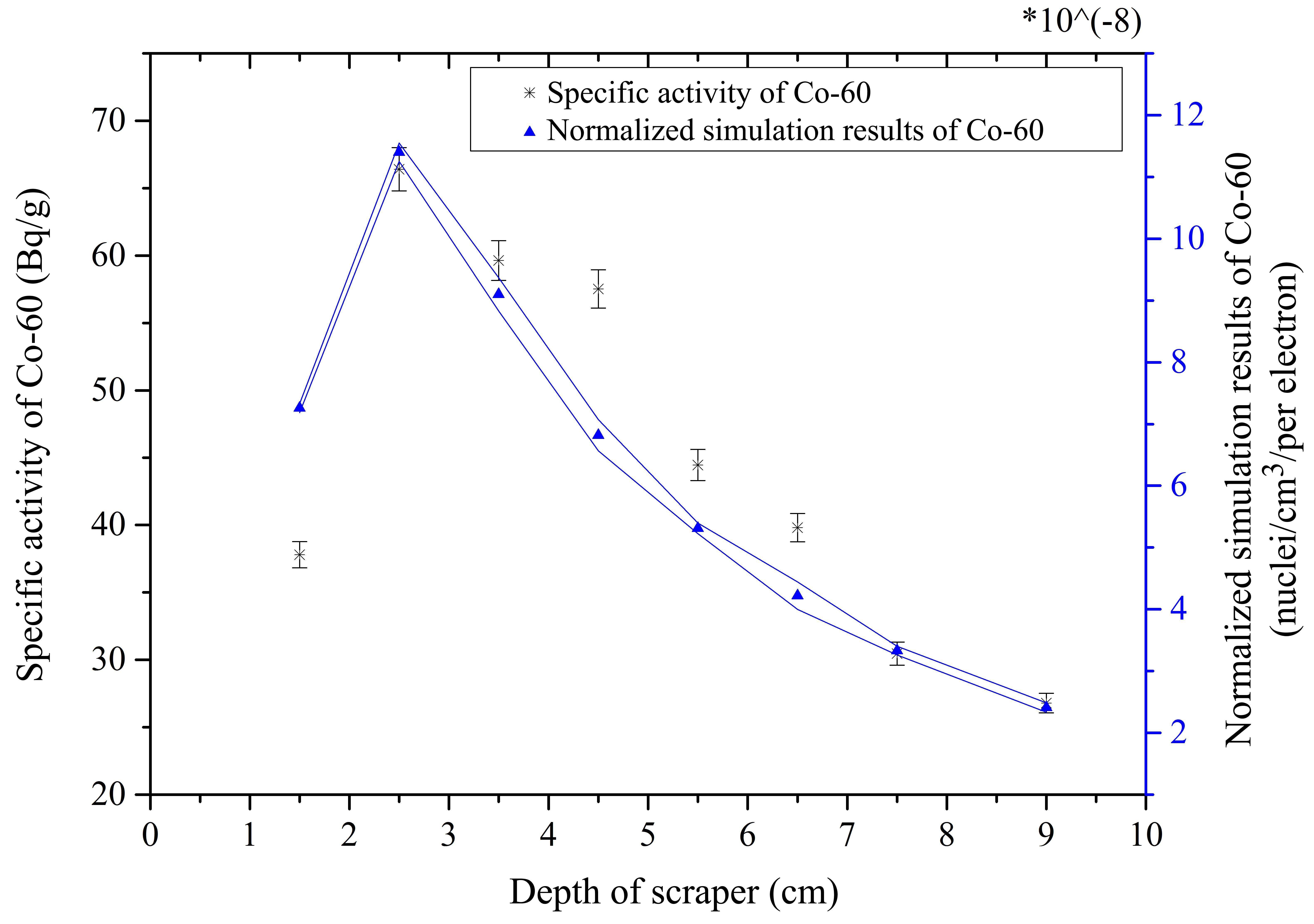 The slicing method was applied to determine the distribution of 60Co along the axial direction of the scraper. The normalized simulation results revealed that the region with the highest concentration of 60Co should include the 2nd, 3rd, and 4th slices. The normalized simulation results for the 60Co distribution and the photon fluence are in good agreement with the trends observed in the measurements. These results confirm the reliability of FLUKA simulations. The results indicate that although the 2nd, 3rd and 4th slices represent 1/3 of the volume of the scraper, they contain 50% of the total 60Co in the scraper. These scraper slices were therefore the focus of the scraper handling procedures. According to GB 16487.7-2005 [17], the upper limit on 60Co in non-ferrous metal waste is 0.3 Bq/g. The 2nd scraper slice, with the highest specific activity of 60Co, must therefore be sealed in the waste repository for approximately 29 years.