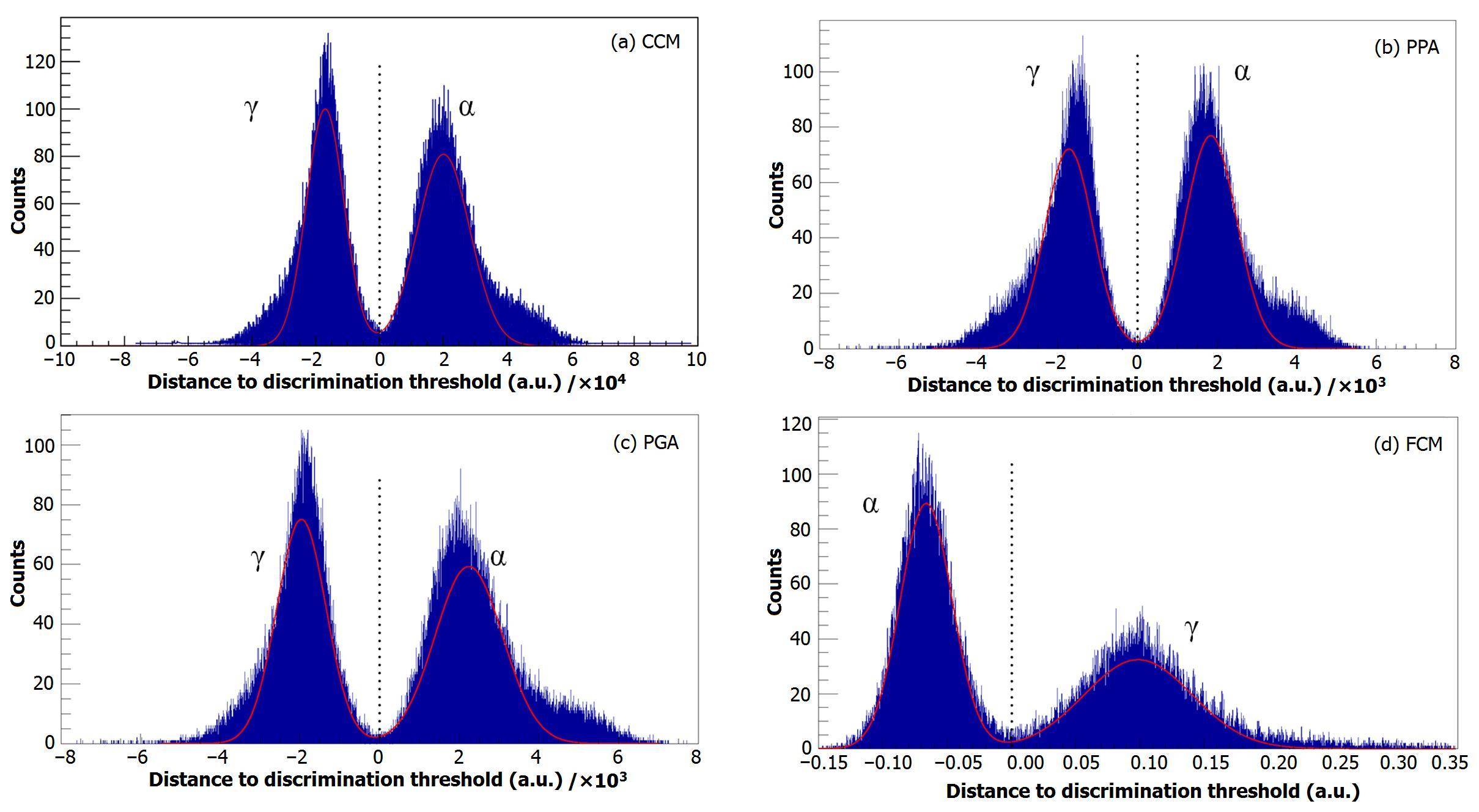 After extracting the pulse information, the results are presented in a 2-D scatter plot of the variables corresponded to each PSD algorithm, as shown in Fig. 4. Fig.4 (a) shows the scatter plot of the CCM algorithm. The short integrals for 170000 events plotted against the long integrals: γ-rays are identified as points above the discrimination threshold (the black solid line), while α-particles are identified as points lay below it. Figs.4(b) and 4(c) are scatter plots of PPA and PGA. Particularly, in Fig.4 (d), for the FCM algorithm, with the FIR-peak-ratio being in the ordinate, and the ratio of short integral/long integral in the abscissa, γ-rays are identified as points below the discrimination threshold, while α-particles are identified as points above it. Furthermore, to evaluate the separation of γ-ray and α-particle regions, in Fig.5 the identification spectra are obtained by calculating the distance to the discrimination threshold line in the scatter plots for each event. The spectra are fitted with Gauss function shown as the red curves, and the full width at half maximum (FWHM) of the γ-peak as well as the α-peak in the spectra are compared in Table 1. More intuitively, figure-of-merit (FOM) values for the four methods can be calculated by Eq. (1), as shown in Table 1: