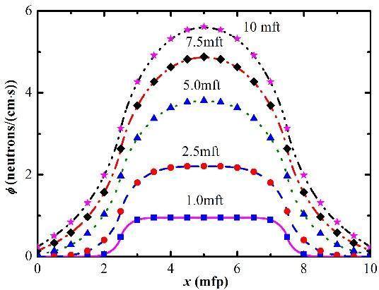 For these simulations, the source turns on at t=0+, and for the first three problems it keeps for the whole simulation. For the last issue, the source switches off at 1 mft. The source remains at a constant strength level of 1.0 n/cm3 s throughout the turned on situation. The velocity of particles released from the source is 1.0 cm/s. All processes have the vacuum boundary (i.e., the medium is surrounded by a vacuum or nonreflecting region, so that the neutron current density entered from outside equals to zero). Eq. (13) shows the homogeneous initial/boundary conditions used in all of the following examples. And in each simulation, the mesh step is 0.01 mfp and the time step equals to 0.025 mft. The number of discrete directions is M =20. The other non-trivial numerical parameters used in simulations are Δx =0.001 cm, Δt =0.025 s, q =1 cm−1·s−1, and the convergence criterion is set to that the relative error of two iterations is no more than 1×10−6, for Configurations A and B; while H=10 cm for Configuration A, and H=5 cm for Configuration B.