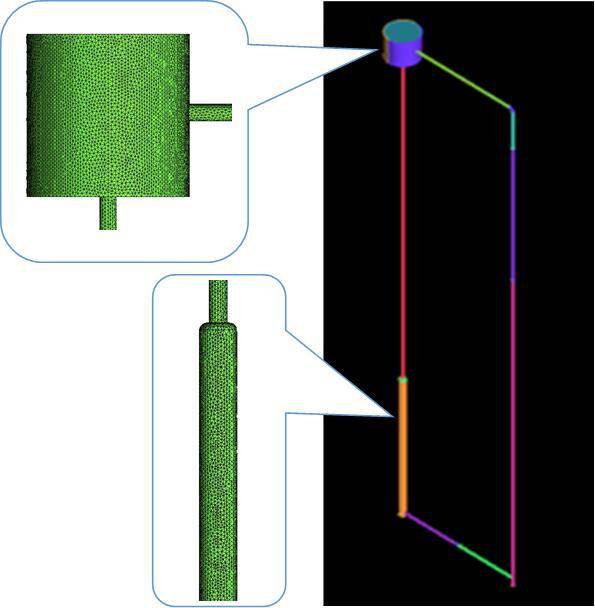 CFD simulations were carried to evaluate the KYLIN-II natural circulation loop, together with the expansion tank. The geometry model of expansion tank, heating rod, and HX was adopted as shown in Fig.2. The valve at the bottom was replaced by a tube. The 3D geometry was modeled in ICEM CFD (The Integrated Computer Engineering and Manufacturing code for Computational Fluid Dynamics) with dimensions of the pipes and other key component described in Section 2. The heating volume did not consist of solid volume, only a surface source on the pin wall was adopted. A commercial code FLUNET was employed to simulate the steady state of natural circulation at different heating powers.