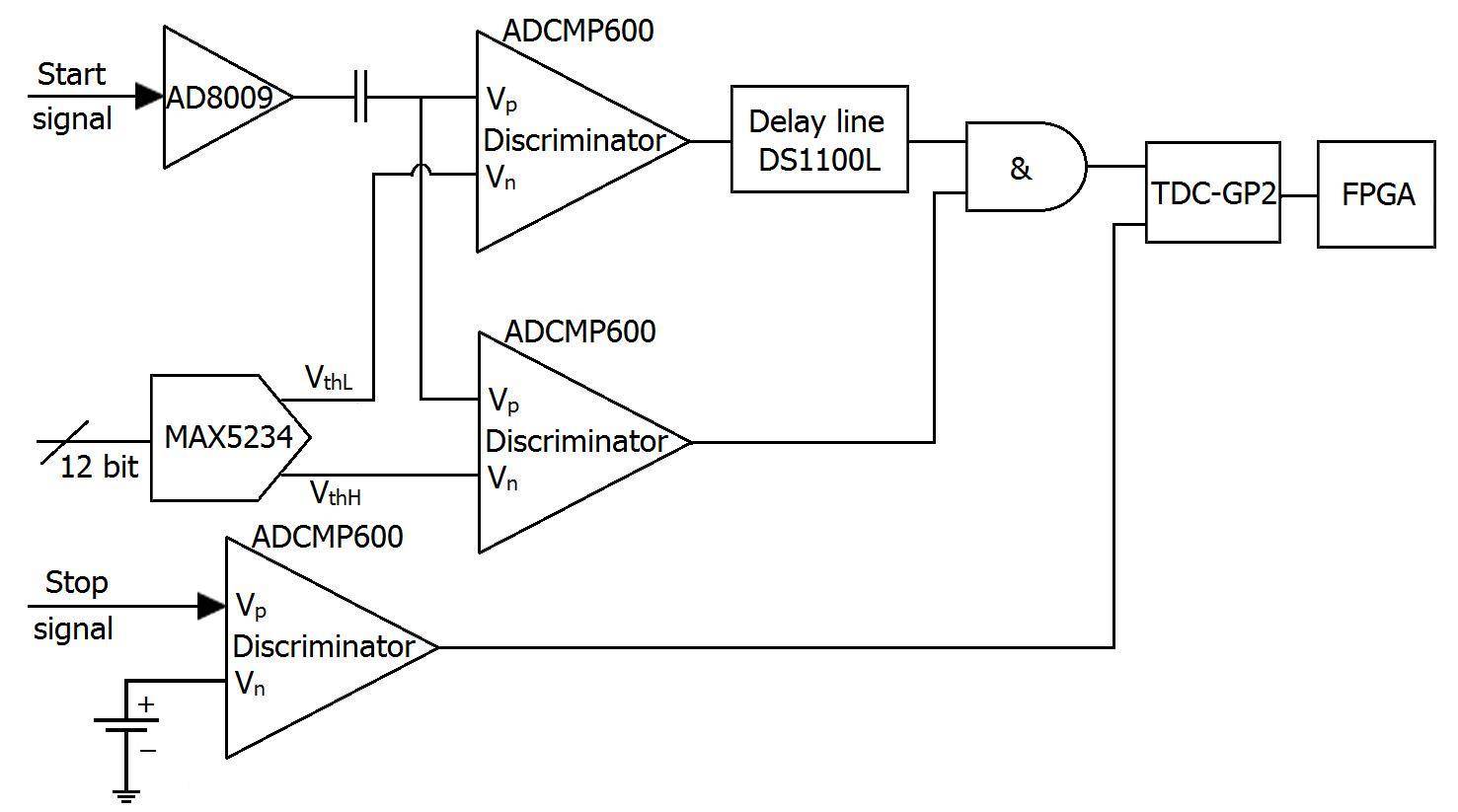 Analog signals are converted into digital signals with timing discriminator for time measurement. To reduce design complexity, the leading edge timing discriminator is employed [7-9]. The time measurement part is shown schematically in Fig. 2. An input start signal passes through two discriminators of different thresholds to a coincidence gate, which is linked by a delay line to the discriminator with low threshold. Then, the start and stop signals pass through the TDC-GP2 chip to the FPGA. TDC-GP2 is a general-purpose TDC chip suitable for cost sensitive applications. Its measurement ranges can be from 3.5 ns to 1.8 μs or from 500 ns to 4 ms [10, 11]. We use the 3.5–1800 ns range with the typical resolution of 50 ps [12].