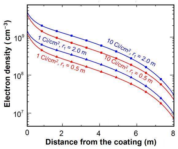 Figure 4 shows electron density distribution of the plasma induced by β-particles from the 90Sr coating in radioactivity of 1 and 10 Ci/cm2, assuming a long cylinder in radiuses of 0.5 and 2 m, respectively. For the cylinder of 0.5-m radius, at 1 Ci/cm2, the electron density of the plasma is 1.56×109 cm−3 adjacent to the 90Sr coating, while it is 6.89×106 cm−3 at 8 m from the coating. As the amount of electron-ion pairs in a unit time increases with the radioactivity, the electron density of the plasma increases accordingly [24]. At 10 Ci/cm2, the corresponding electron densities are 4.95×109 and 2.18×107 cm−3, respectively. Compared to the maximum value, the electron densities are reduced by 2 orders of magnitude at 8 m from the 90Sr coating for both radioactivities. The plasma around the cylinder of 2-m radius yields greater electron density at the same radioactivity and distance, while similar density-decreasing behavior with increasing distance up to 8 m. Therefore, the influence of plasma on the EMW propagation at 8 m from the 90Sr coating can be ignored and 8 m is set as the thickness of the plasma surrounding the cylinder target in the calculation.