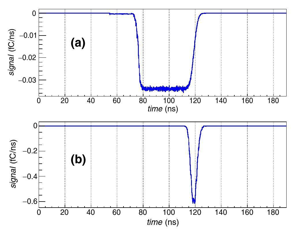 Based on the result of simulation, the current signal caused by the avalanches of primary electrons in a double GEM device is showed in Fig. 4(a). The forming time of the signal is about 50 ns, which is too long for particle discrimination. We reconstructed the detector with an extra Micromesh set 100 μm above the readout PCB, i.e. the new hybrid detector. Fig. 4(b) shows the current signal of this hybrid device. The forming time is about four times shorter than before. The shortening of the forming time means that using the new hybrid detector is the right way to improve on distinguishing between muons and X-rays in our experiment. The forming time of the simulated current signal just reflects the rise time of the amplified voltage signal in the experiment, and the two incident particles were just discriminated by setting an appropriate threshold of the rise time to get the respective results. If the rise time is reduced as the simulation illustrated, the discrimination by hybrid detector will be better than the performance of our triple GEM detector.