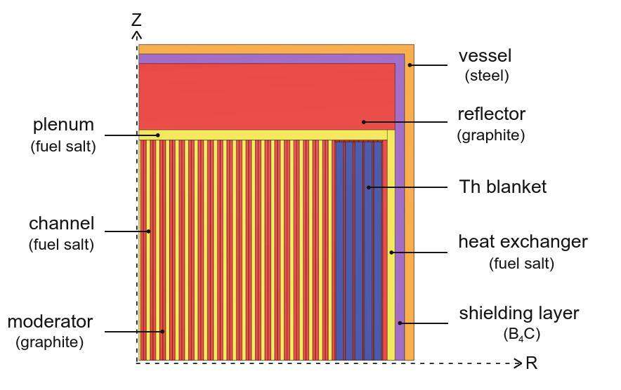 As shown in Fig. 1, a cylinder core (2.1 m radius and 4.6 m height) comprising of a lattice of 10 cm pitch hexagonal elements with hollow cylindrical channels to allow fuel salt circulation is chosen. The radius of these fuel channels is 2.03 cm, corresponding to a salt fraction of about 15%. The total volume of the fuel salt in the reactor is about 20 m3, which contains three parts: the salt in the graphite channels in the core (9 m3), the plenum salt above and below the core (4.5 m3), and the salt in the heat exchangers that are external to the core (6.5 m3). A 50-cm-thick radial thorium blanket is arranged to improve the breeding capacity and it also consists of the same graphite hexagonal elements but with a larger channel radius of about 4 cm. This geometry is based on the optimization by L. Mathieu et al. [22], but the core height to diameter ratio is adjusted to about 1.095 instead of 1.0 in order to improve the temperature reactivity coefficients in such a thermal MSR.