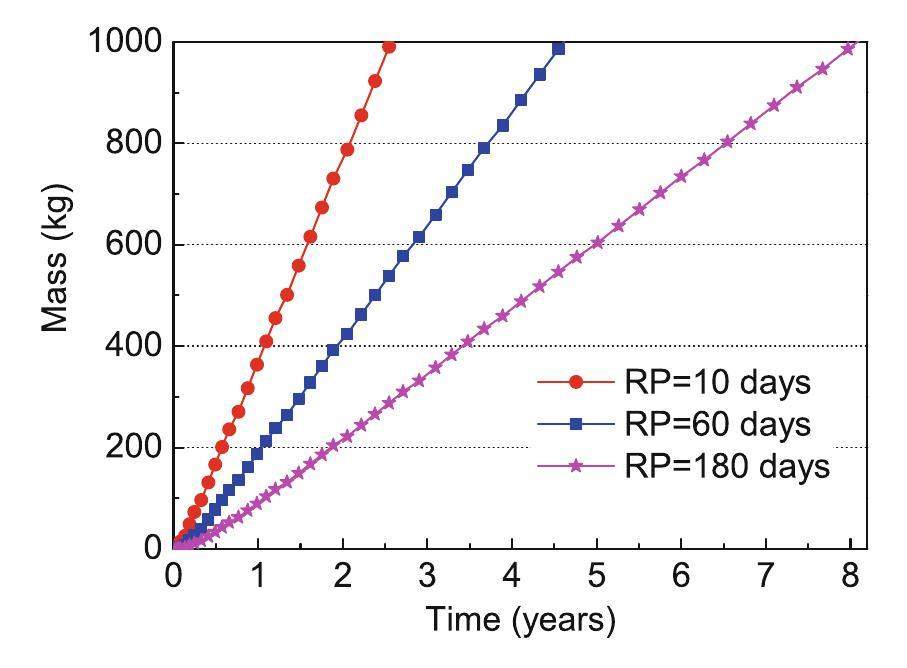 It can be concluded from the discussion in Sect. 3 that the MSR can achieve the fuel transition from a plutonium to a thorium fuel cycle under the B&B scenario when employing a RP of no more than 2 months. In this section, the PB&B scenario, defined above, is analyzed in order to provide an alternative option for 233U production and fuel transition, particularly under limited processing conditions. The PB&B scenario stores the bred 233U outside the core rather than refueling it back into the core in the B&B scenario, which is advantageous to produce enough 233U as quickly as possible for starting a new reactor operating on the Th/233U fuel cycle. Similarly, three groups of PR options are employed. Fig.12 gives the net 233U production for different RP options. For the startup of the reactor described in Section 2, about 753 kg of 233U is required at the initial time. The maximum net 233U production shown in Fig. 12 is about 1000 kg which is enough for startup and feeding before the reactor becomes self-sustaining.