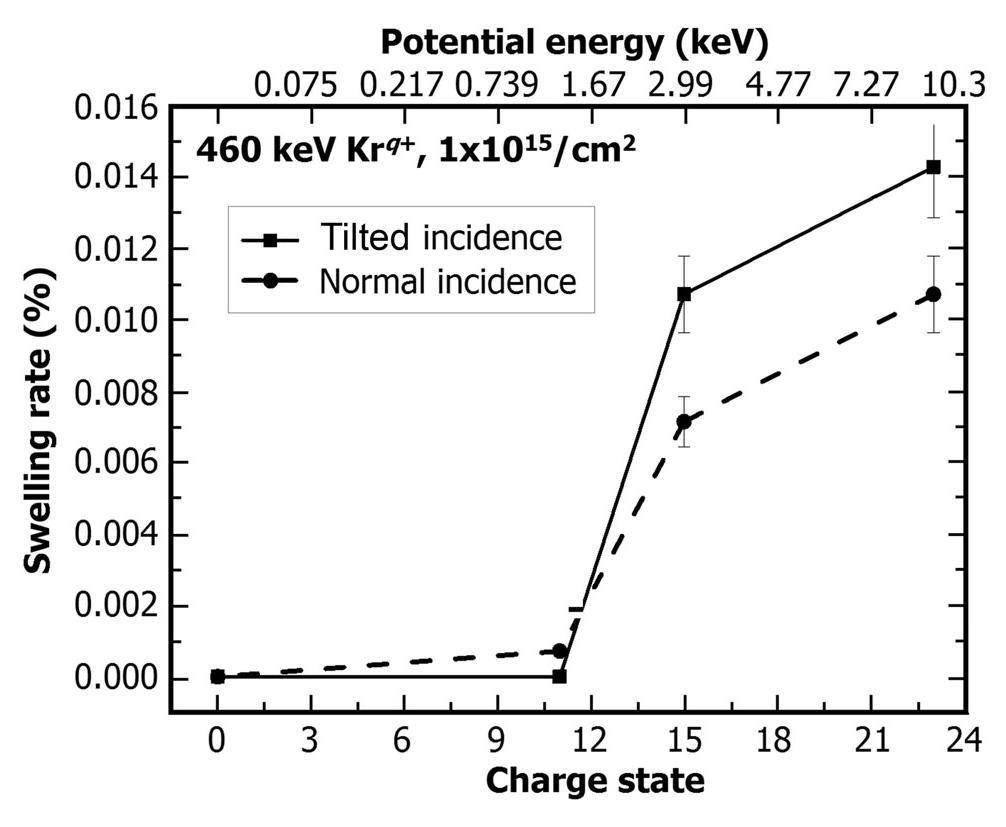 Fig.2 shows the dependence of surface swelling rate on charge state of the Krq+ ions for the GaN samples irradiated in normal and 60° incidence. The swelling rate was defined as the formed step height over the ions range. It increased with the charge state, due to higher potential energy deposition. The step heights were 2.0, 1.5, and 0 nm for Kr23+, Kr15+ and Kr11+ at 60° incidence, respectively; while they were 1.5, 1.0 and 0.1 nm for Kr23+, Kr15+ and Kr11+ at normal incidence, respectively. The trajectory range of 460 keV Krq+ in GaN film is about 140 nm. At the same charge state, the swelling rate for tilted incidence is larger than that for normal incidence. This is probably due to the larger deposition area for tilted incidence.