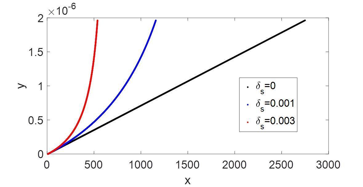Figure 4 shows the influence of the systematic error. In Eq. (11), x and y represent a linear relation without errors. The systematic error destroys the linearity resulting in an x and y of the quadratic curve. The noise error was a random number with a small value. Figure 5 shows how the noise error affected the relationship of x and y. Without the noise error, x and y form a line or a quadratic curve. When the noise error was added, a simple curve cannot be used to represent x and y. The data with errors deviated from the curve without the noise error. A large noise error implied that the data deviated from the curve. Even the systematic and noise errors destroyed the linearity of x and y, and the linearity existed for small x values. From Eq. (8) and the reflection coefficient curve of a resonant cavity, the value of x near the resonant frequency was small. This condition implies that the data obtained near the resonant frequency contained minimal errors.