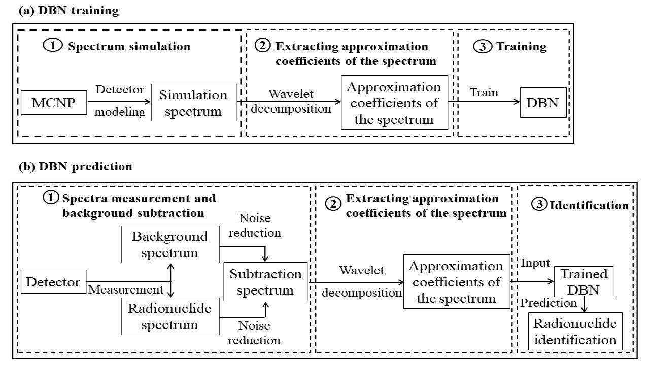 The proposed method is composed of DBN training and DBN prediction (Fig. 1). The DBN is trained according to the flowchart shown in Fig. 1(a). This technique consists of spectrum simulation, extraction of approximation coefficients of the spectrum, and training. First, the model of the related detector is designed, and simulation spectra of the radionuclides of interest are obtained using the Monte-Carlo N-Particle transport code (MCNP) (a software package for simulating nuclear processes). Second, approximation coefficients of the spectrum are extracted by wavelet decomposition and normalized to eliminate the intensity difference between different spectra. Then, the normalized approximation coefficients are used as the input to the DBN. Finally, the DBN is trained using the samples of the simulation spectra, which are encoded as the input of the DBN and their target output. For DBN prediction, the trained DBN is used to predict the isotopic composition of the spectrum measured in the real environment using the process shown in Fig. 1(b). This process consists of spectral measurement and background subtraction, extraction of the approximation coefficients of the spectrum, and identification. First, radionuclide and background spectra are detected by the detector and smoothed to reduce noise interference. Then, the subtraction spectrum is obtained by subtracting the portion of the smoothed background spectrum according to the ratio of the radionuclide scan time to the background scan time from the smoothed radionuclide spectrum. Second, the approximation coefficients of the subtraction spectrum are extracted by wavelet decomposition and normalized to remove the effect of the change in spectrum intensity. Then, the normalized approximation coefficients are used as the input for the DBN. Finally, the trained DBN is used to predict the isotopic composition of the spectrum measured in the real environment, and the identification performance of the proposed method is evaluated by comparing the output of the DBN with its target output.