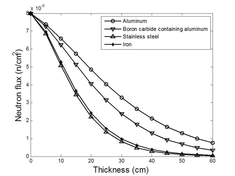 Heavy metal materials are used to moderate fast neutrons. The shielding properties of aluminum, iron, stainless steel, and boron carbide-containing aluminum were simulated. The source was a 14.1 MeV isotropic neutron. The fast neutron (E>1 MeV) flux 1 m from the source was counted with the change in the thicknesses of materials. The results are shown in Fig. 5.