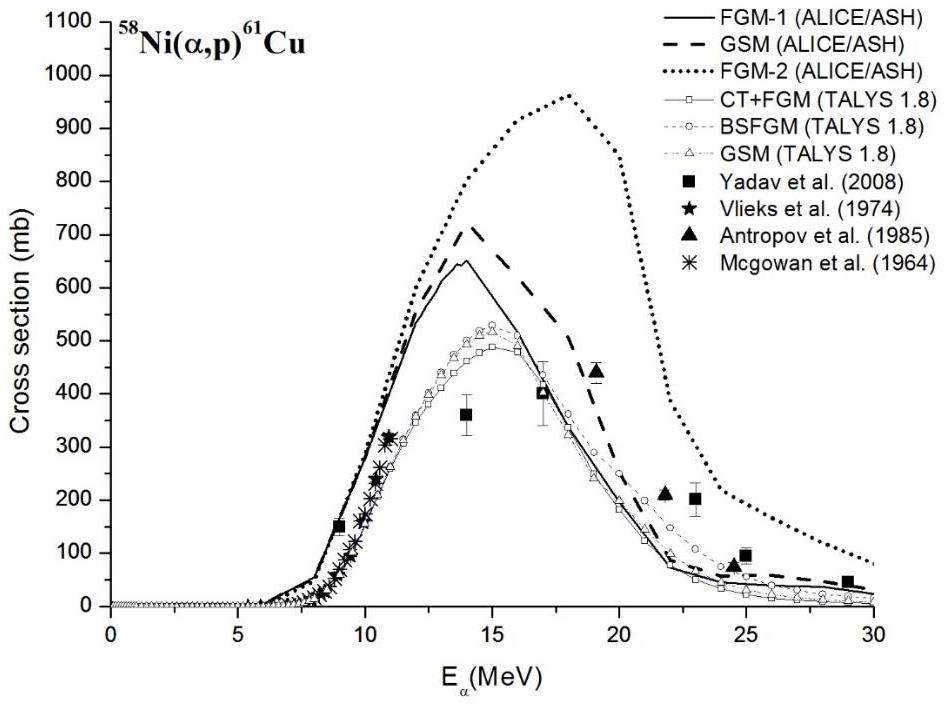The calculated excitation functions used in the different level density models in the two-component exciton model are close to each other and are in good agreement with the experimental data [53,57,58] up to ~ 12 MeV, except for one set of data by Yadav et al. [50] at 9 MeV (in Fig. 5 ). Also, the excitation functions of the 58Ni(α,p) reaction to the production of 61Cu were analyzed by Aslam and Qaim using the EMPIRE and the BSFGM in the TALYS 1.4 codes [59]. When the Aslam and Qaim study and the present one for the 58Ni (α,p) reaction are compared, the results are close to each other. For the 64Ni(α,p) reaction, the calculated excitation functions using the GSM in the two–component exciton model are more compatible with experimental data [51,52,58,60] than those of other models in Fig. 6. Also, Levkovski’s experimental data for this reaction and 60,62Ni(α,n), 60Ni(α,2n), and 64Ni(α,p) reactions in Figs. 1 -3,6 are considerably different in behavior than those of other experimental data. The reason of this may be due to Levkovski’s use of a different target holder, which was a rotating target for the simultaneous irradiation of a few foils [51].