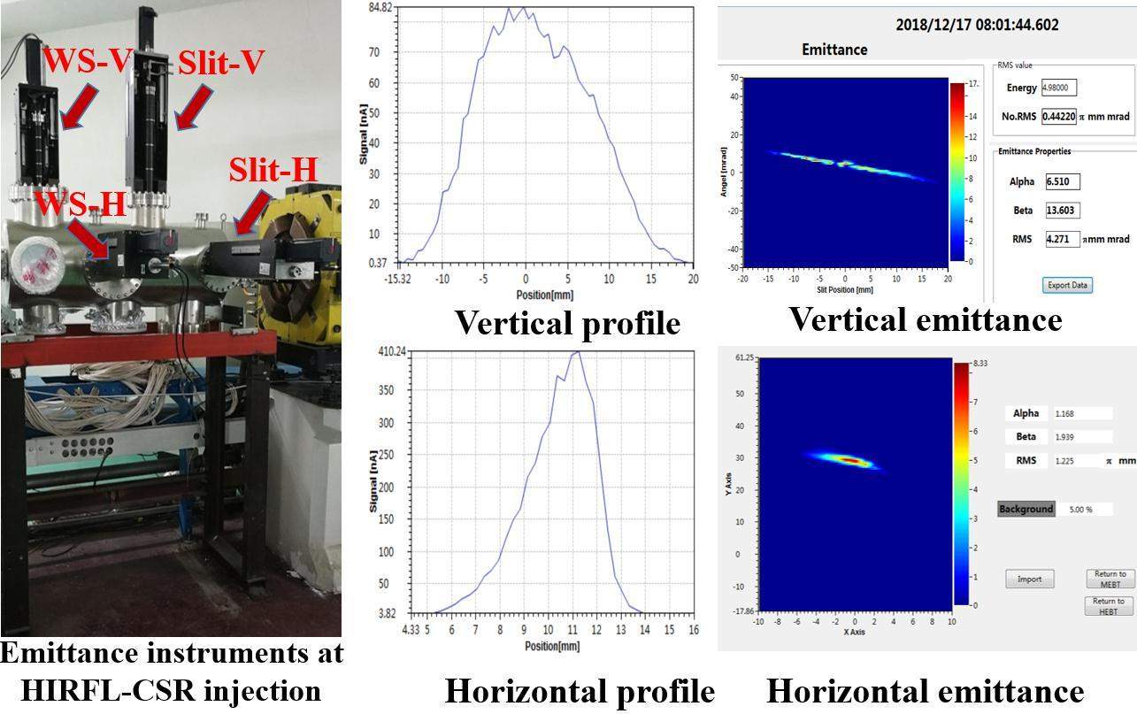At the same time of the new IPM deployed in August 2018, the transverse emittance instruments were also installed at the injection line of HIRFL-CSRm, which comprise two sets of the slit and wire scanner systems. As shown in Fig. 14, the cylindrical tungsten wire has a diameter of 35 μm and the tantalum-copper slit is set a width of 0.2 mm. The distance between the slit and the wire scanner is 495 mm in the vertical direction and 480 mm for the horizontal orientation, respectively. The control panel is also built on an EPICS system to calculate the beam Twiss parameters online. This interceptive method is especially suitable for the relatively weak beams around 1 μA at the HIRFL-CSRm injector.