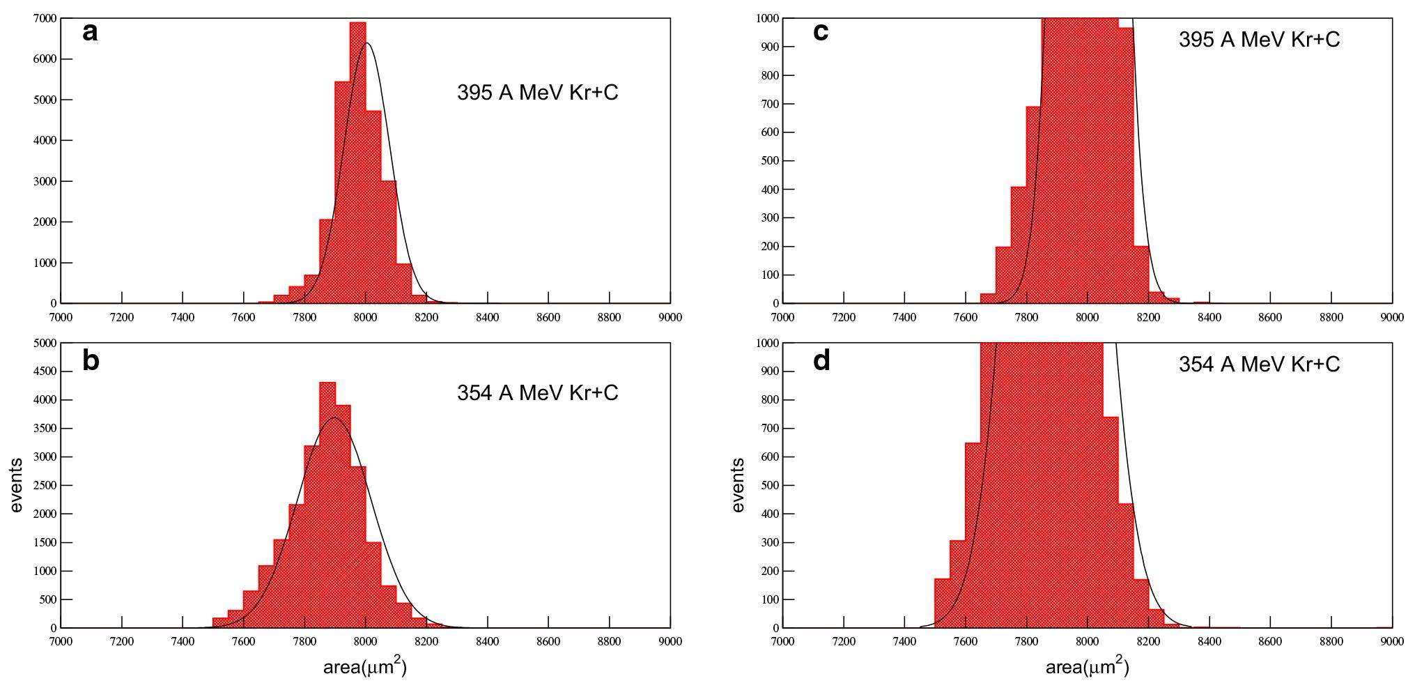 Figure 2 shows the etched track area distribution of beam particles that pass through the target without changing charge and fragments with increased charge for 84Kr on two Al targets: (a) and (b). For clarity, the interrupted distribution is shown in (c) and (d). A Gaussian fit was applied to the etched track area distribution of surviving beam particles because of the natural Gaussian distribution. The surviving beam particles were determined in the region of four times the standard error to ensure all the surviving beam particles (more than 99.99%) were selected as beam particles. Subsequently, the number of charge pickup events were determined. The same procedure was used for the 84Kr beam on C and CH2 targets. Figure 3 and Fig. 4 show the etched track area distributions of beam particles that pass through the target without changing charge and fragments with increased charge for 84Kr on C and CH2 targets, respectively.