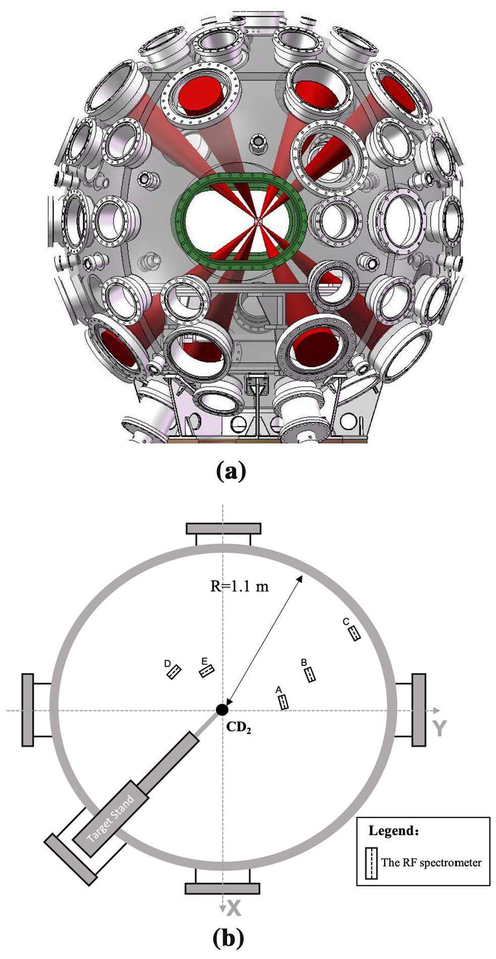 Experimental setup. (a) Schematic view of the target chamber, with eight laser beams focused on a flat deuterated polyethylene target. (b) Schematic view of the X-Y plane of the target chamber, with the location of the target, and five RF spectrometers (A-E) highlighted.