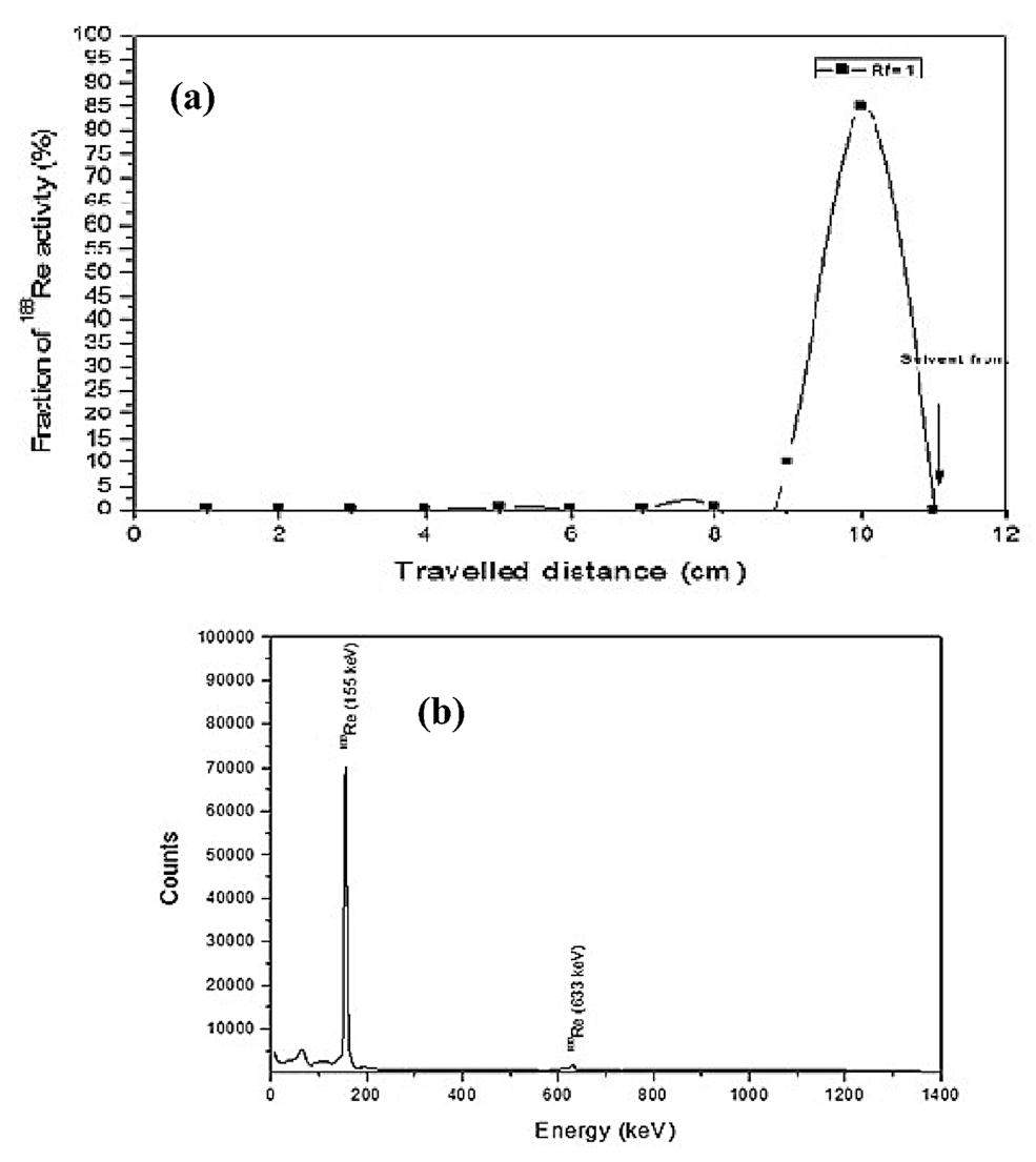 The ascending paper chromatography technique employing a Whatman No. 3 paper and acetone as a developing solvent was used to determine the purity of 188Re. Figure 2(a) shows a single peak corresponding to 98±0.06% radiochemical purity at Rf = ~1, related to 188ReO4‒ [8].