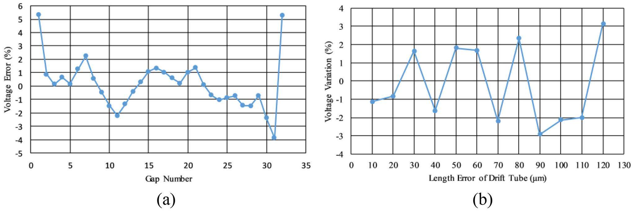 The lengths of the DTs along the beam axis are also critical to the cavity design, and are dependent on the precision of the computer numerical control (CNC) lathe and the machining process used for manufacturing the DTs. The precision of the start and end point positions of each DT during the machining determines the length of the DT. The errors in the lengths of the DTs result in a voltage variation. To meet the gap voltage errors requirement of ±2% from the beam dynamics, we analyzed the voltage variation on several error ranges of drift tube-lengths from 10 μm to 120 μm with an interval of 10um. In each case, the DTs with random errors were generated and evaluated. The results are shown in Fig. 13b. Allowing for a safe margin and the precision which the machining process could handle, the tolerance of the DTs was determined to be within ±50 μm, and this meets the gap voltage error of ±2 % from the beam dynamics [2].
