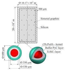 Microencapsulated fuel (microfuel) for a fuel pellet of HGTRU (Fig. 3, [1]) is a spherical fuel kernel of fissionable material (Th; Pu)O2 with a diameter of 350 μm, covered successively by layers of pyrolytic carbon (PyC) and Ti3SiC2. These fuel kernels are dispersed into a graphite matrix of cylindrical fuel pellets (Fig. 3), which are placed in the fuel block.