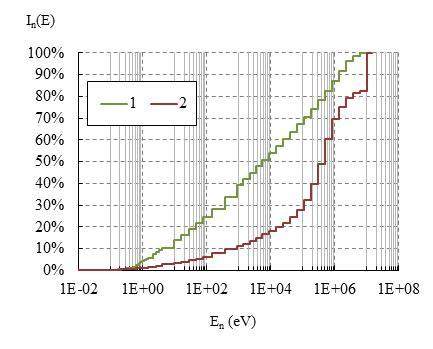 To compare the neutron spectrum ϕSn(E) (Fig. 13) with the spectrum ϕVn(E) (Fig. 6) correctly, ϕSn(E) was derived in the energy group structure WIMS69 (WIMS-D5B), and an additional neutron group with energy from 10.5 to 14.5 MeV (Fig. 14) was used. The neutron flux distribution functions