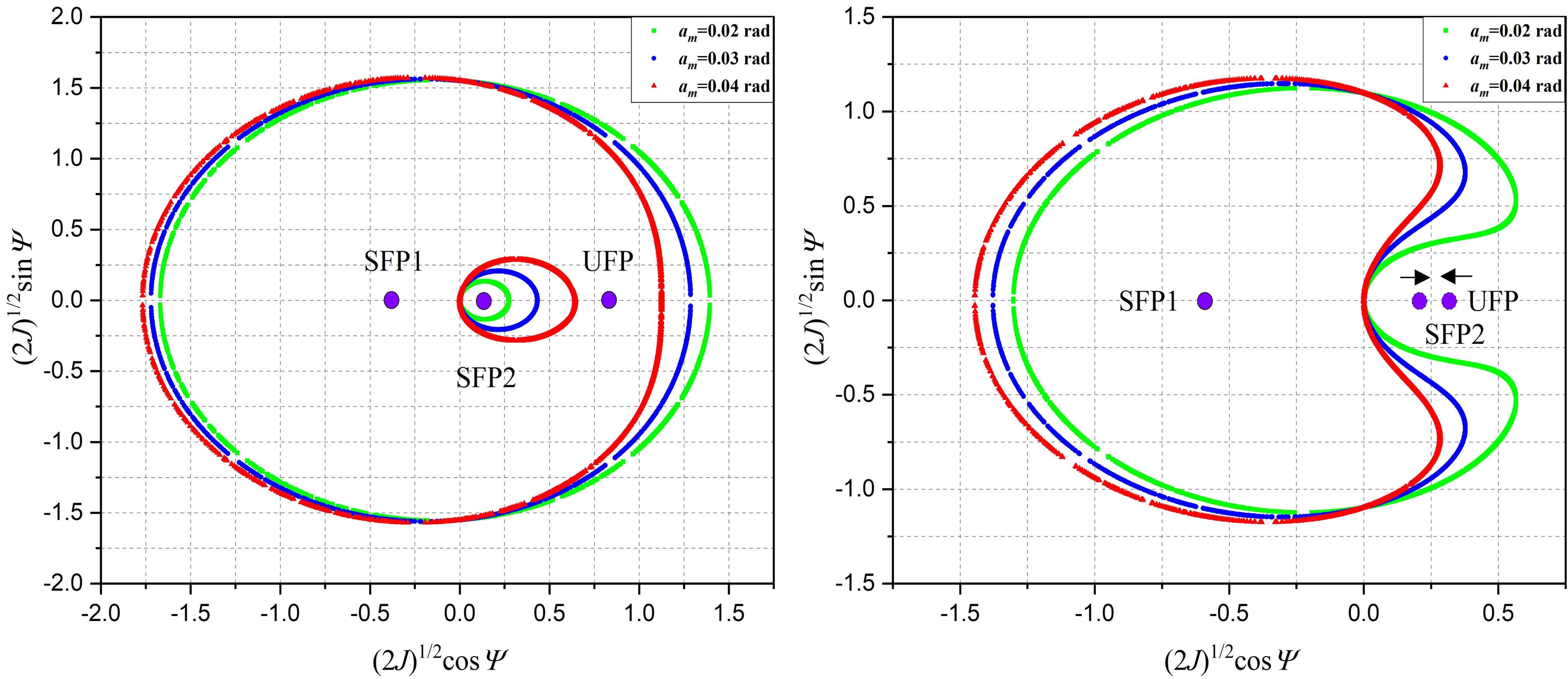 Typically, the completed parametric resonant Hamiltonian is an invariant related to the value of the modulation amplitude and frequency. This indicates that the trajectory of the particle motion is along the constant Hamiltonian torus. With Jt=0 and ψt=0, the fixed points of the system are obtained, which can be characterized for the resonance islands. In terms of the abovementioned RFPM theoretical model, Eq. (6), we simulate the single-particle trajectories versus different modulation amplitudes, as shown in Fig. 1. The formation and annihilation mechanisms and processes of the resonance islands are also explored. The simulation parameters are set as follows: the synchrotron frequency fs is 21.3 kHz, the phase angle ϕs of a synchrotron particle is 172°, and the original bifurcation frequency fbif is computed as 20.6 kHz [1, 3].