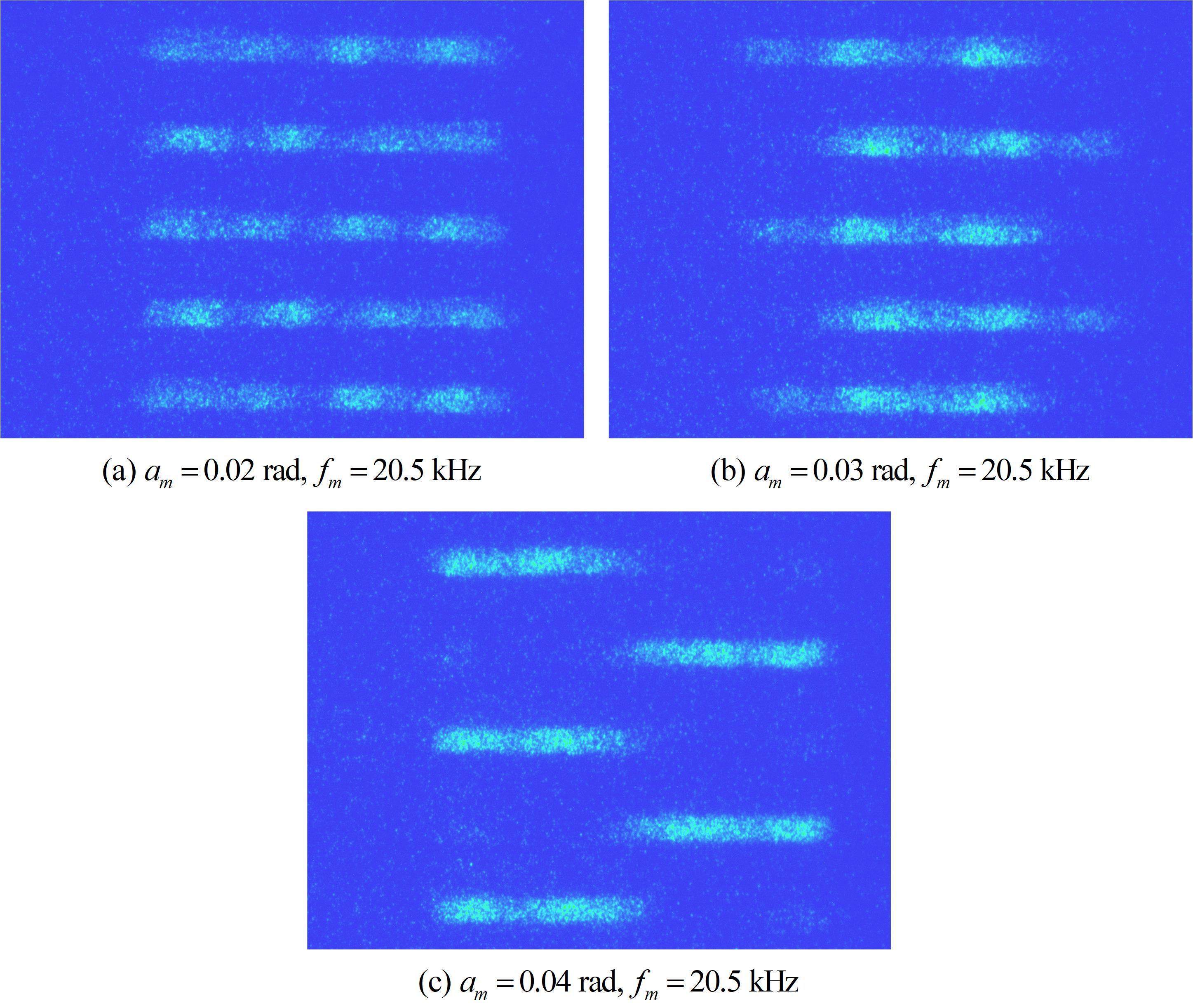 As depicted in Fig. 7, we select longitudinal bunch distribution images at equal intervals of 0.20 kHz captured by the streak camera. It is clear that the longitudinal distribution, bunch length, and oscillation amplitude vary with the modulation frequency fm. It is found that the island phenomena are gradually produced notably as fm approaches the bifurcation frequency of 20.6 kHz. In contrast, the resonance islands gradually disappear when fm is larger than the bifurcation frequency. Correspondingly, the influence of particle diffusion gradually increases and subsequently decreases over the range of 19.5–20.9 kHz.